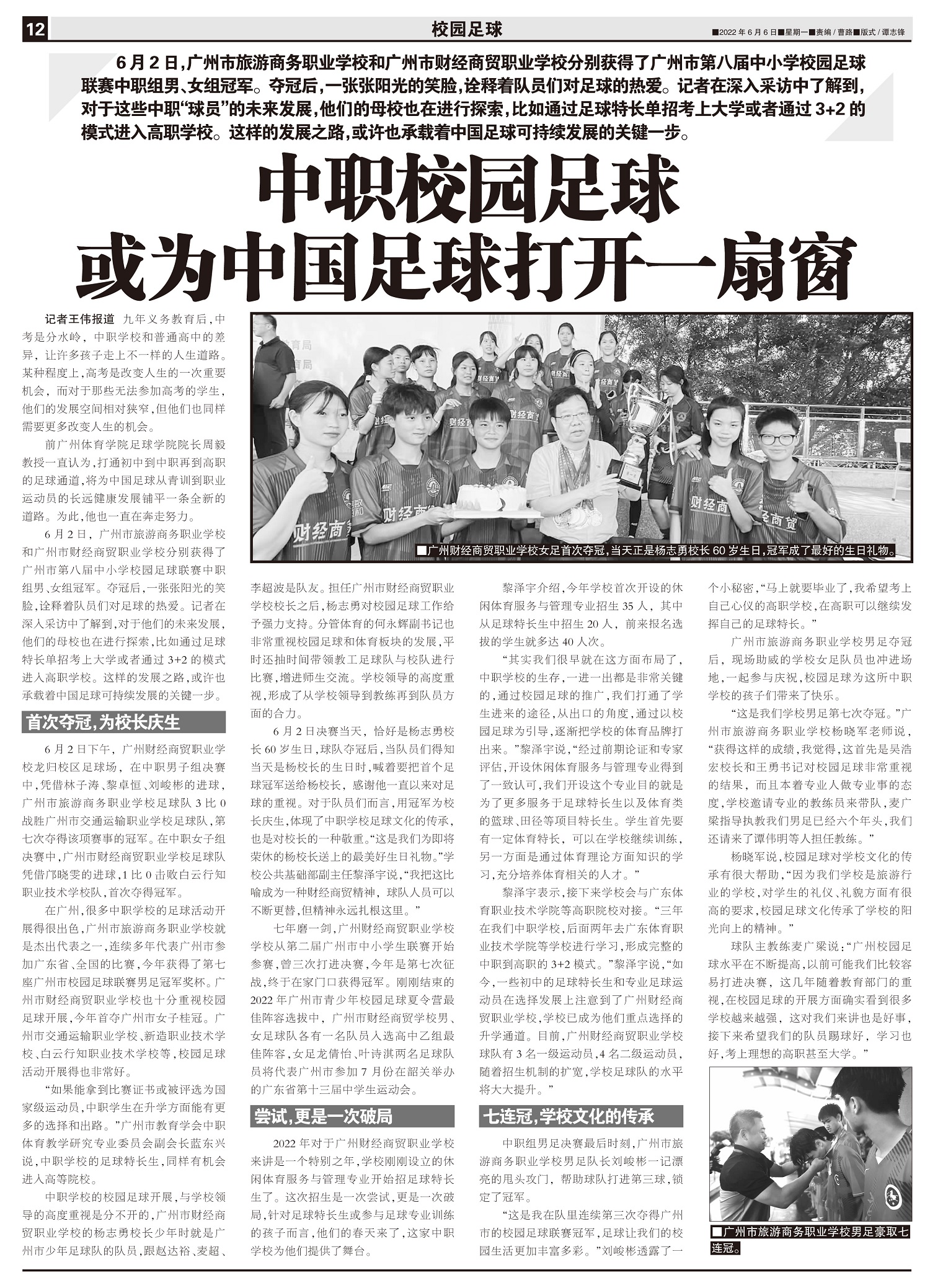 6月2日,广州市旅游商务职业学校和广州市财经商贸职业学校分别获得了广州市第八届中小学校园足球联赛中职...