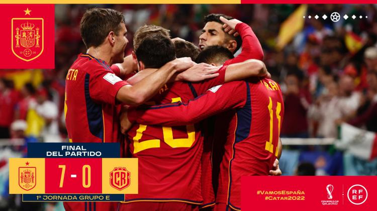 记者寒冰报道 7比0,西班牙锋芒毕露,露出了冠军相。恩里克麾下年轻的球队,击溃了以防守顽强闻名的哥斯达黎加,6名攻击手进球,主教练的“准女婿”费兰·托雷斯更是梅开二度。对前皇马门将纳瓦斯领衔的中北美第三名而言,斗牛士军团过于强大了。西班牙传控足球的巅峰在卡塔尔重现,恩里克的球队全场控球率高达81.3%,是1966年世界杯有这项统计以来单场最高;传球数更是以976次对165次彻底碾压——976次的传球,超过了伊朗、哥斯达黎加、沙特、日本和波兰5支球队首战传球数(906次)的总和。西班牙门将乌奈·西蒙全场几乎无事可做,因为哥斯达黎加在本场比赛成为了世界杯有数据统计以来第二支全场零射门球队,而上一个倒霉蛋,则是1990年的哥斯达黎加。7比0的比分,也是西班牙自1934年首次参加世界杯以来,单场最大分差的赢球纪录,巧合的是,此前的纪录(1998年世界杯小组赛6比1保加利亚),现任西班牙主帅恩里克还曾作为球员参与并进了球。不过,当年西班牙是在小组已经出局背景下轻装上阵击溃对手,这次则是首战即显示了强大的争冠实力。7个进球超过西班牙此前至少7次世界杯的单届进球数,即便在西班牙正式比赛历史上,也能排进第11位,大赛决赛圈仅次于2013年联合会杯10比0横扫大洋洲冠军塔希提。恩里克的女儿茜拉是这个夜晚最幸福的人之一,现场观战的她不仅看到父亲率领国家队打出七球大胜,更见证男友费兰·托雷斯在世界杯首秀交出的完美成绩单。巴萨前锋与奥尔莫、阿森西奥组成进攻端三叉戟,两位“00后”小将佩德里和加维辅佐布斯克茨,防线则意外地由后腰罗德里与拉波尔特组成曼城铁闸——首发阵容有5人低于25岁,加上替补总计达8人,占出场人数的一半,西班牙的年轻力量,令人艳羡。开场半小时便3比0领先,恩里克的球队也成为2014年世界杯半决赛7比1横扫巴西的德国后,第二早确立3球优势的球队;同时,他们也是西班牙在世界杯历史上,第二次上半场攻入3球——第一次是1934年首度参赛,3比1击败巴西。奥尔莫让西班牙成为世界杯历史第6支总入球超过100个的球队,除了巴西(229球)、德国(227球)遥不可及,追上阿根廷(138球)、意大利(128球)和法国(124球)还是很有可能的。西班牙掀起的青春风暴震惊了世界足坛,18岁零110天的加维,成为队史最年轻的大赛出场球员,佩德里也追平姆巴佩,成为大赛20岁以下出场次数最多的球员(7次)。两人与老将布斯克茨联袂,几乎完全控制了中场,前半小时,西班牙控球率高达84%,奥尔莫、阿森西奥和费兰·托雷斯这三叉戟分别进球,早早锁定胜局。哥斯达黎加不是塔希提那样的鱼腩,世界杯前近24场比赛,单场失球没超过2个,墨西哥、美国都曾拿他们没办法。但早在2017年11月的热身赛时,西班牙就曾5球大胜,那也是此役前5年来,哥斯达黎加最大的败绩,当时,西班牙主帅还是洛佩特吉,伊涅斯塔尚在队内,此役中前场6名首发球员,只有布斯克茨是亲历者。14年前的2008年欧洲杯半决赛,阿拉贡内斯的西班牙3球击败黑马俄罗斯,球队行云流水般的传控足球就此扬名天下,也开始了西班牙的“红色王朝”。14年后,西班牙如演奏小提琴一般的流畅表演再现:首发没有中锋,也没有前腰,5名年轻球员的默契让所有人震惊。上半场斗牛士军团就完成了549次传球,创下世界杯历史半场传球次数最高纪录的同时,也将夺冠热门的实力充分展现给了所有的观众。世界杯开幕前,瑞士体育研究机构“足球天文台”以复杂的数学建模评估了32强球员和球队,结论是巴西、西班牙分列夺冠热门前两位,梅西领衔的阿根廷仅排名第7位,从首战表现来看,瑞士人的评估不算离谱。