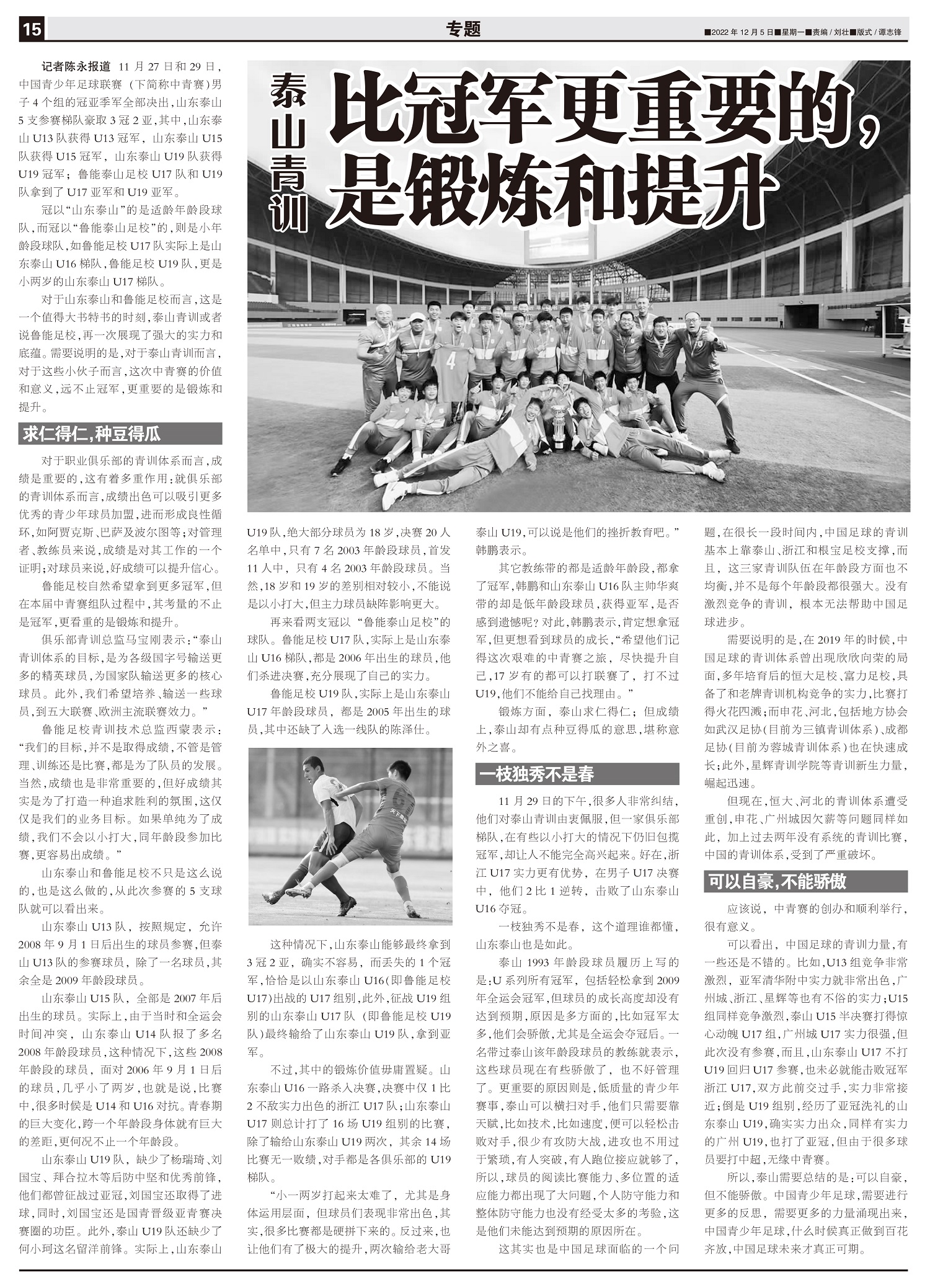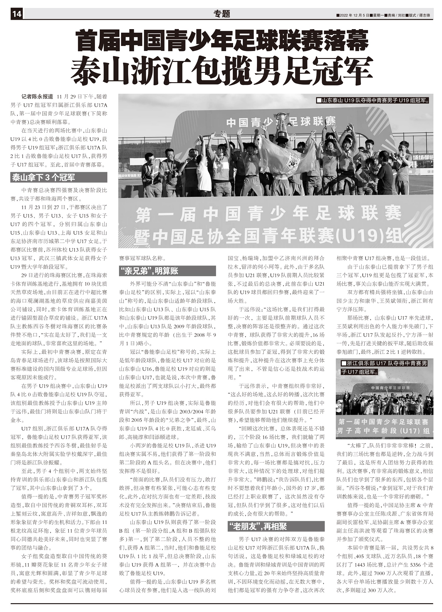 11月27日和29日,中国青少年足球联赛(下简称中青赛)男子4个组的冠亚季军全部决出,山东泰山5支参...