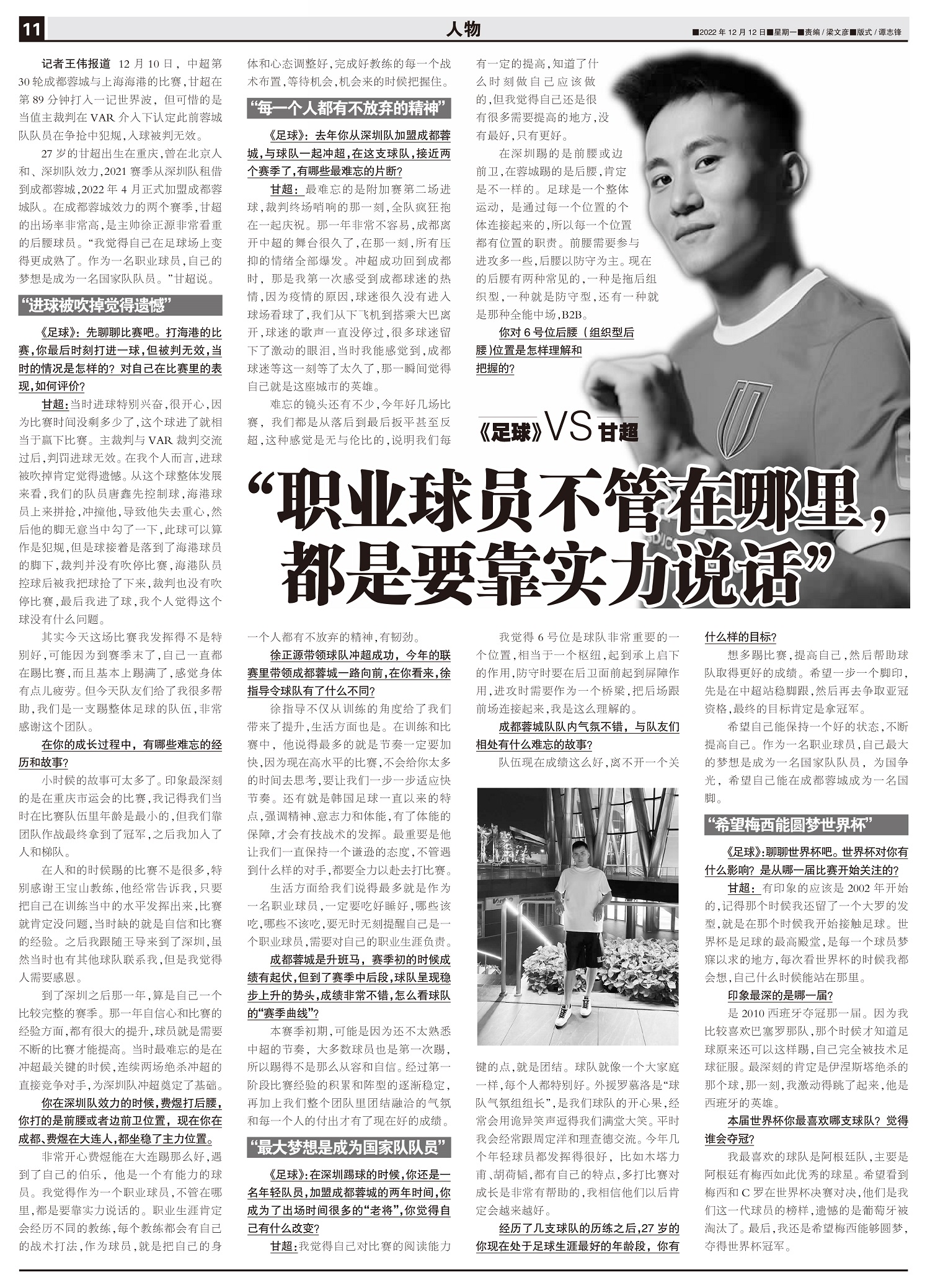 《足球》 VS 甘超 “职业球员不管在哪里, 都是要靠实力说话”