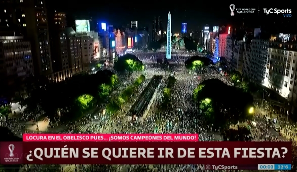 阿根廷夺冠当晚,以首都布宜诺斯艾利斯的地标方尖碑为中心,遍布整个阿根廷的23个省,数百万球迷疯狂庆祝。首都的7月9日大道停满了球迷的车辆,甚至阿根廷最南端的火地岛也都充满了狂欢的氛围。有狂热的球迷爬上方尖碑的顶端,这座地标建筑也被投影打上梅西捧杯的画面,当然还有浪漫的烟花。不仅是在卡塔尔的4万阿根廷人彻夜狂欢,还有本土的4700万人。梅西幼子西罗或许还无法真正理解父亲经历了什么,但他的大哥蒂亚戈、逐渐长大的顽皮鬼二哥马特奥和所有阿根廷的孩子们都会记得这一刻——21世纪阿根廷最值得铭记的纪念日,是一个新的神话的诞生。与马拉多纳一样,梅西在阿根廷深陷经济和社会危机之际,带给了所有苦难中的阿根廷人最大的快乐。
