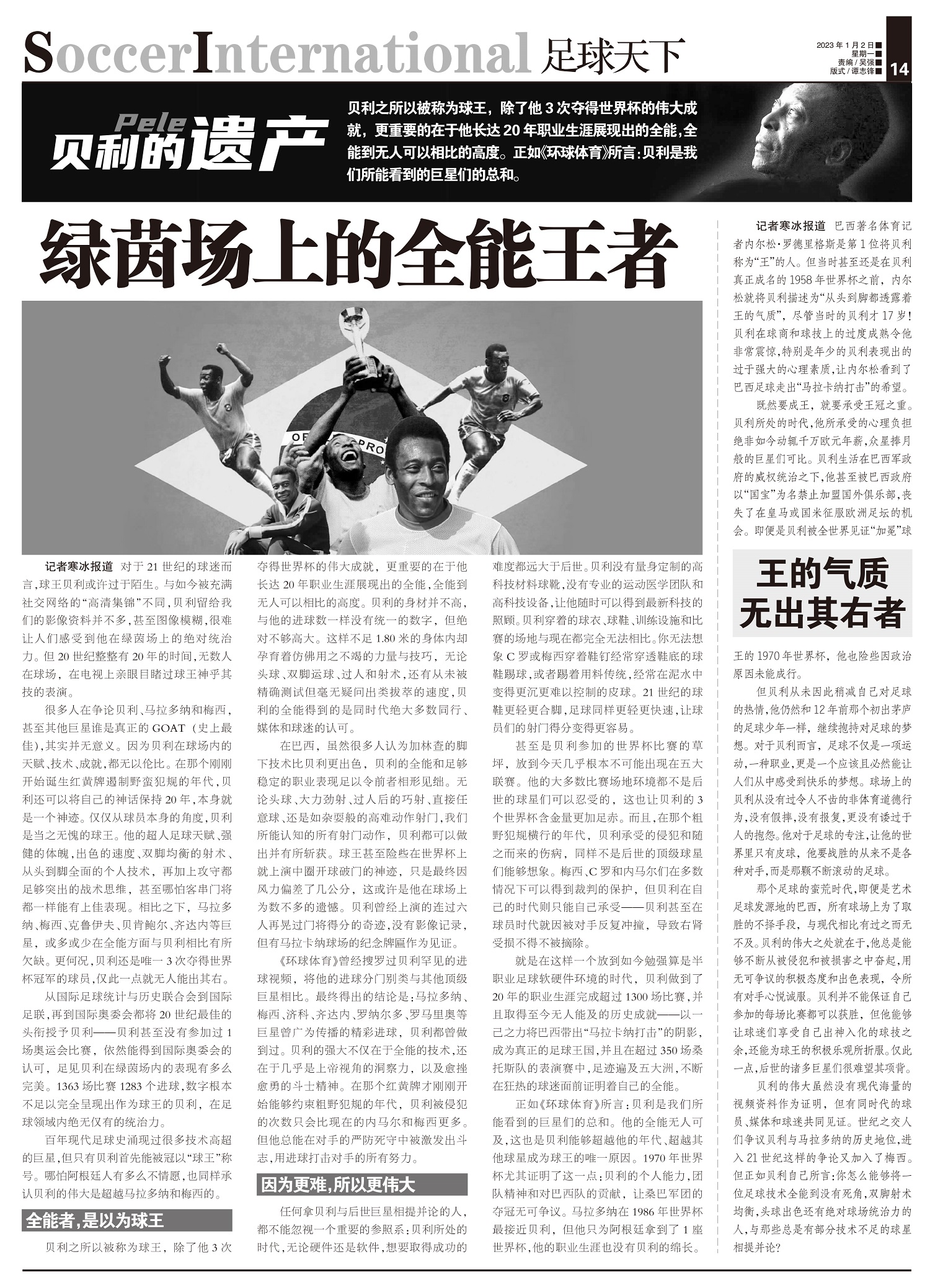 贝利的遗产贝利之所以被称为球王,除了他3次夺得世界杯的伟大成就,更重要的在于他长达20年职业生涯展现...