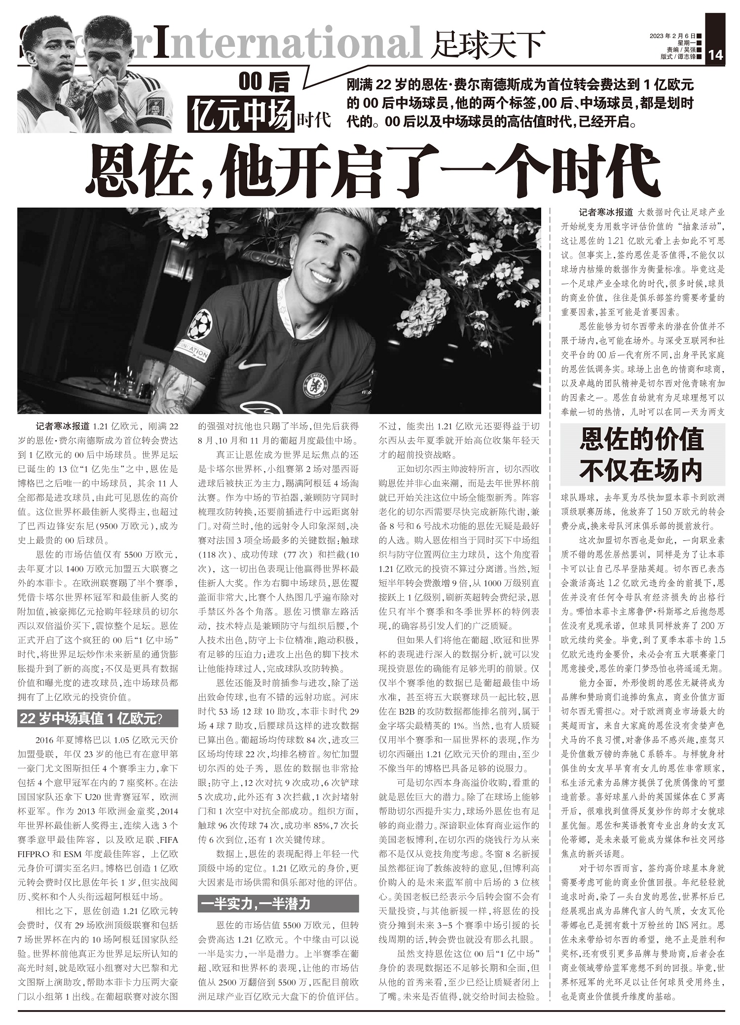 00后亿元中场时代刚满22岁的恩佐·费尔南德斯成为首位转会费达到1亿欧元的00后中场球员,他的两个标...