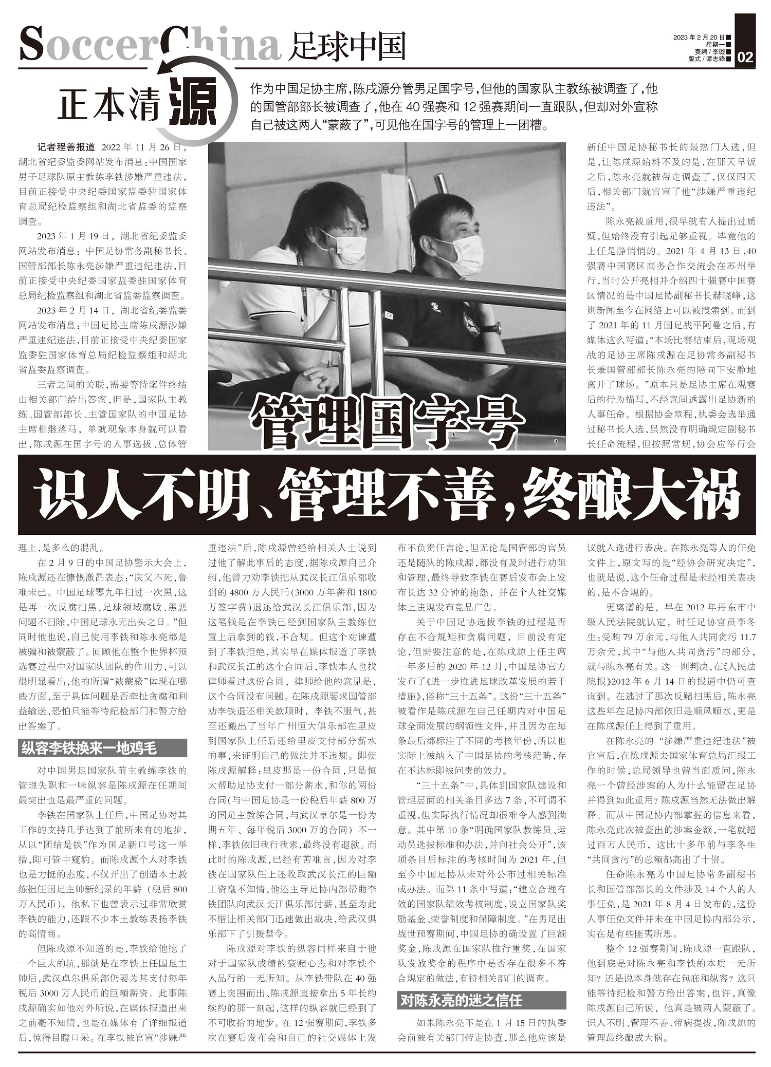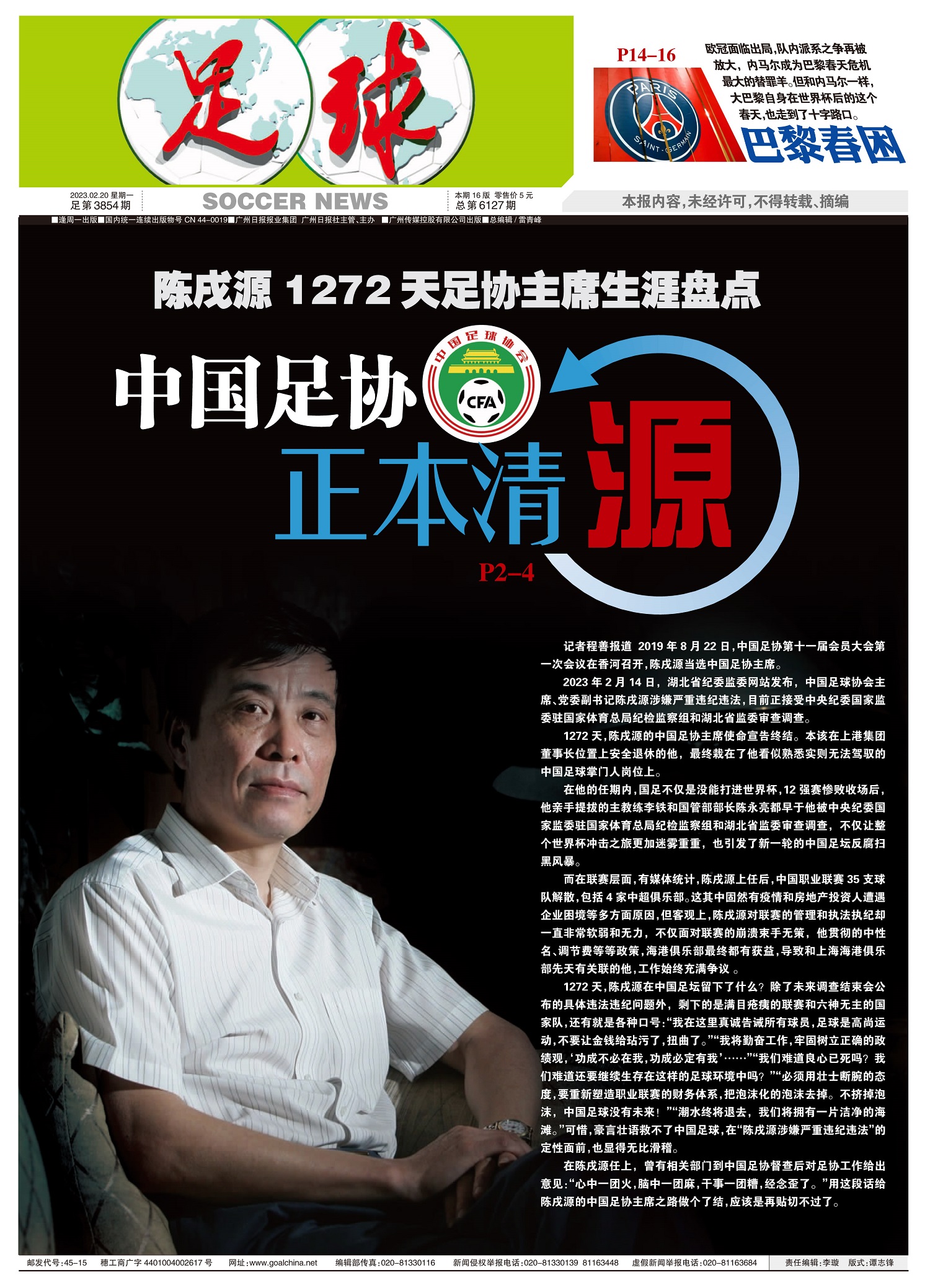 正本清源作为中国足协主席,陈戌源分管男足国字号,但他的国家队主教练被调查了,他的国管部部长被调查了,...