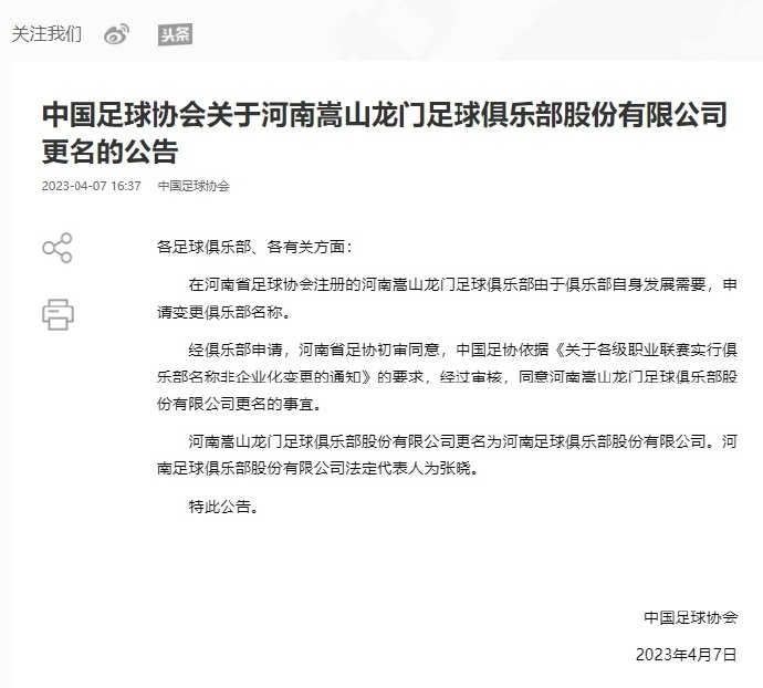 俱乐部更名,最早发布消息的是中国足协,公告称:经俱乐部申请,河南省足协初审同意,中国足协依据《关于各级职业联赛实行俱乐部名称非企业化变更的通知》的要求,经过审核,同意河南嵩山龙门足球俱乐部股份有限公司更名为河南足球俱乐部股份有限公司。河南足球俱乐部股份有限公司的法定代表人为张晓。