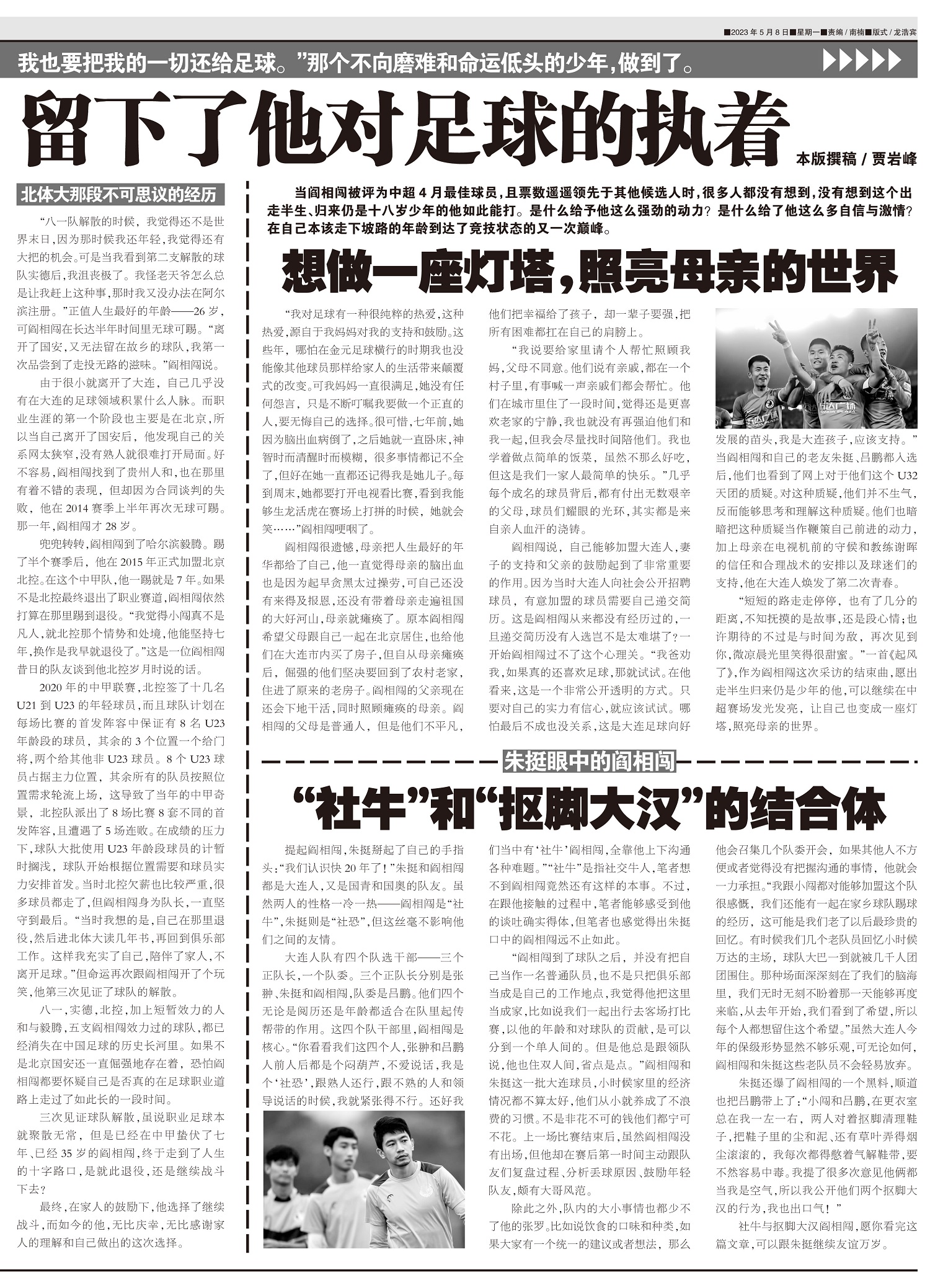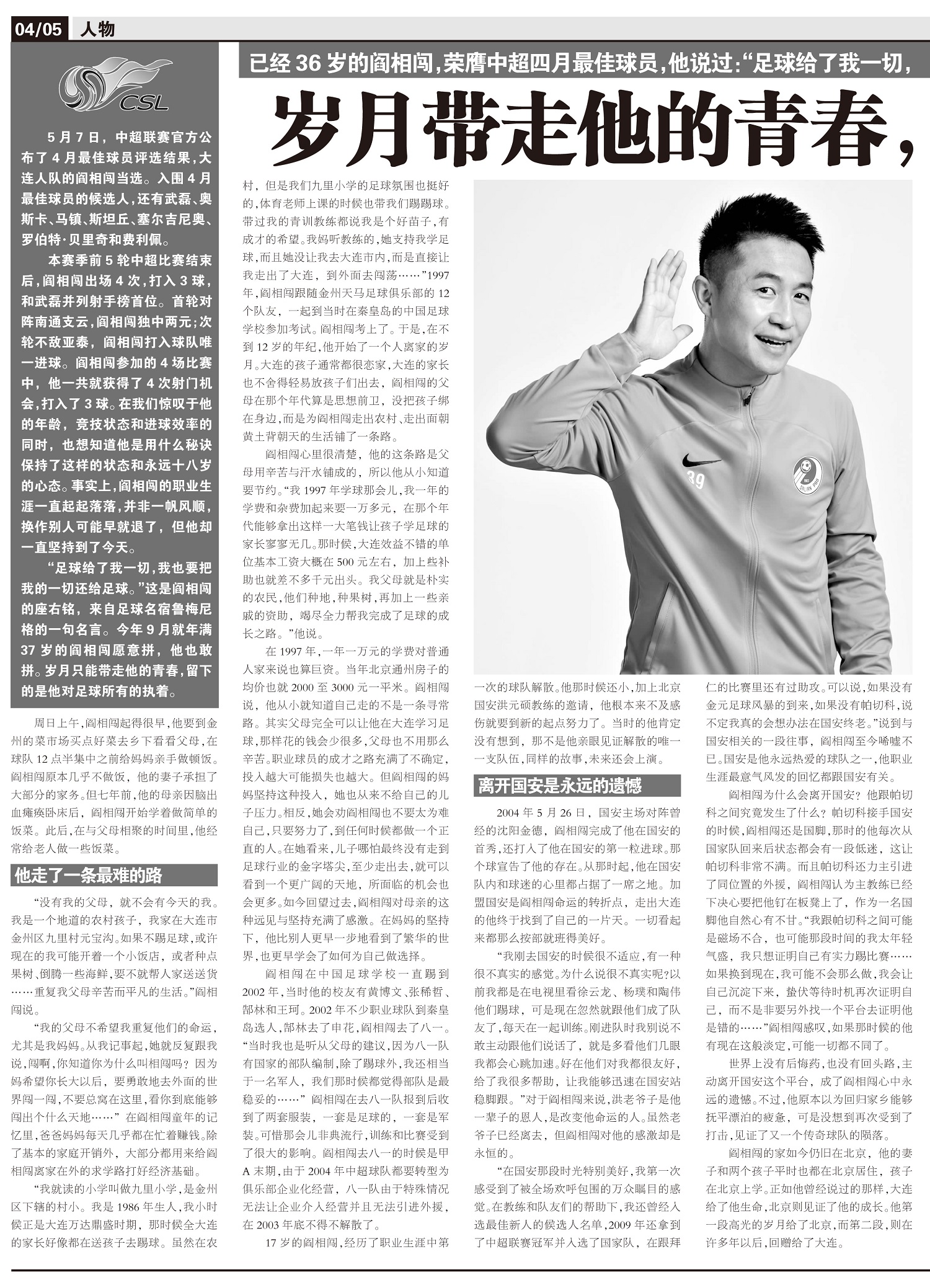 已经36岁的阎相闯,荣膺中超四月最佳球员,他说过:“足球给了我一切,我也要把我的一切还给足球。”那个不向磨难和命运低头的少年,做到了。岁月带走他的青春,留下了他对足球的执着