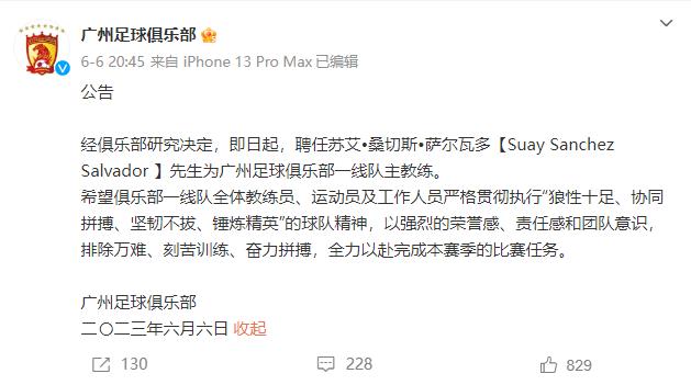 记者王伟报道 6月6日晚,广州俱乐部官宣,刘智宇教练团队下课,此前担任恒大足校U17A队主教练的西班牙人萨尔瓦多出任主教练。萨尔瓦多上赛季曾在三镇担任预备队主教练,此番担任广州队主教练,他的目标首先是保级,然后把自己高压紧逼、快节奏、掌控比赛的打法运用到球队当中,争取打造一支有竞争力的队伍。