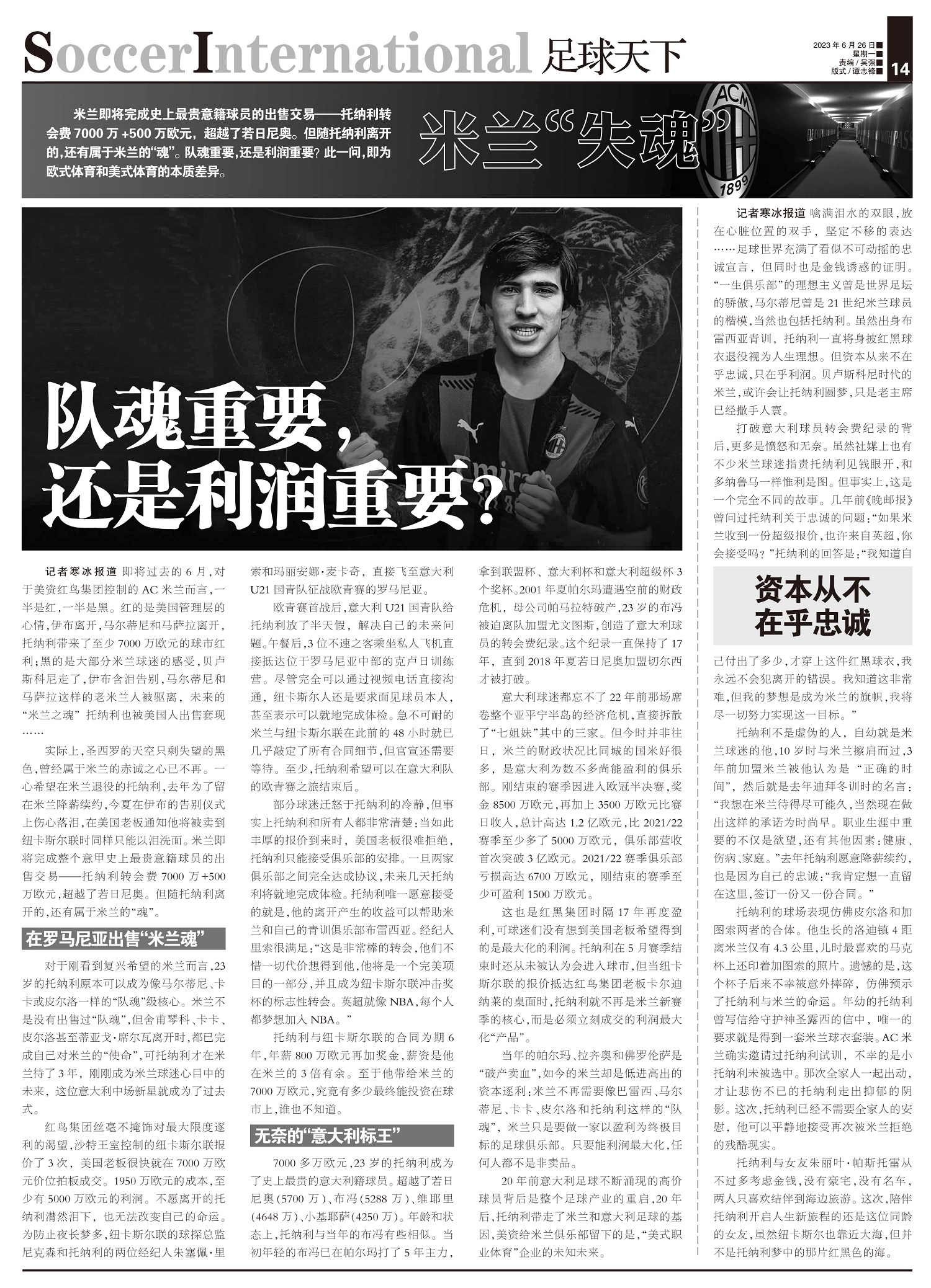 米兰失魂米兰即将完成史上最贵意籍球员的出售交易——托纳利转会费7000万+500万欧元,超越了若日尼...
