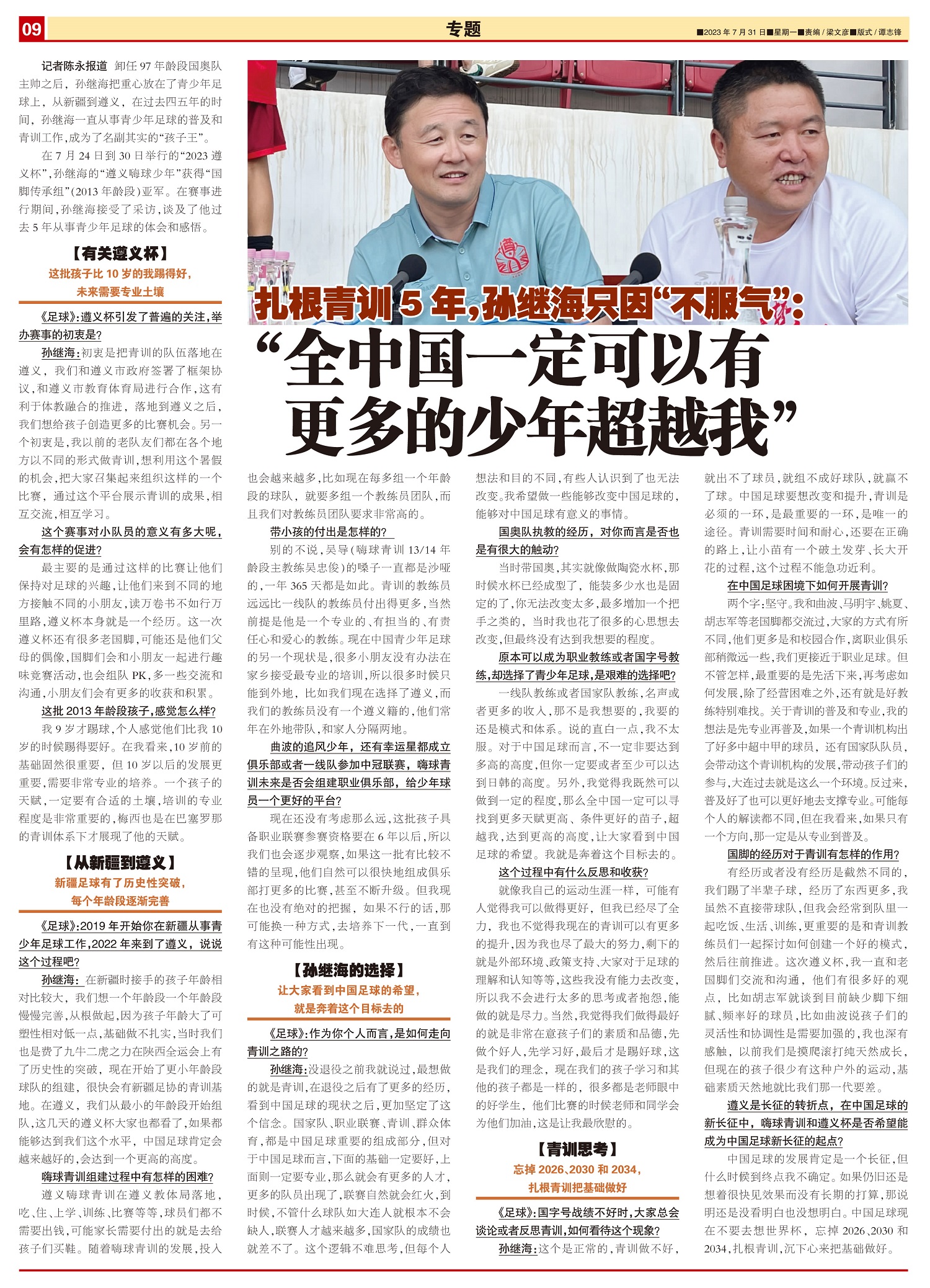 卸任97年龄段国奥队主帅之后,孙继海把重心放在了青少年足球上,从新疆到遵义,在过去四五年的时间,孙继...