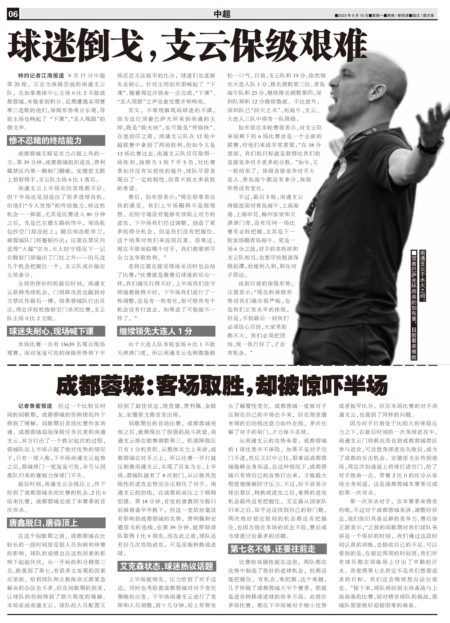 9月17日中超第25轮,正在为保级苦战的南通支云队,在如皋奥体中心主场0比2不敌成都蓉城,未能拿到积...