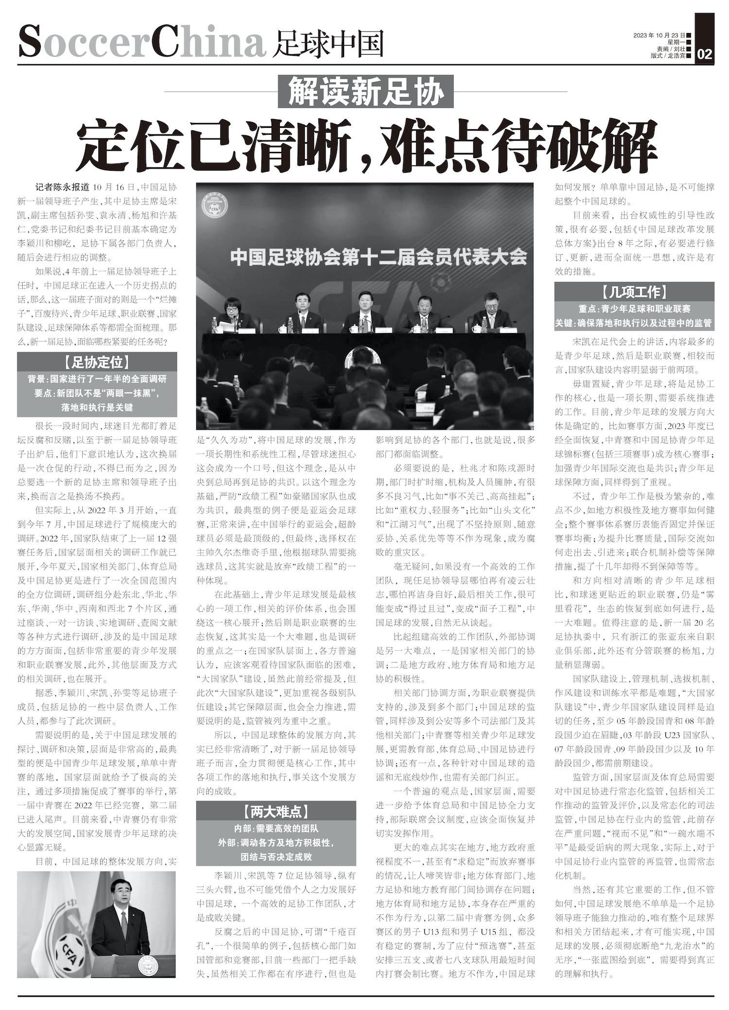 10月16日,中国足协新一届领导班子产生,其中足协主席是宋凯,副主席包括孙雯、袁永清、杨旭和许基仁,...