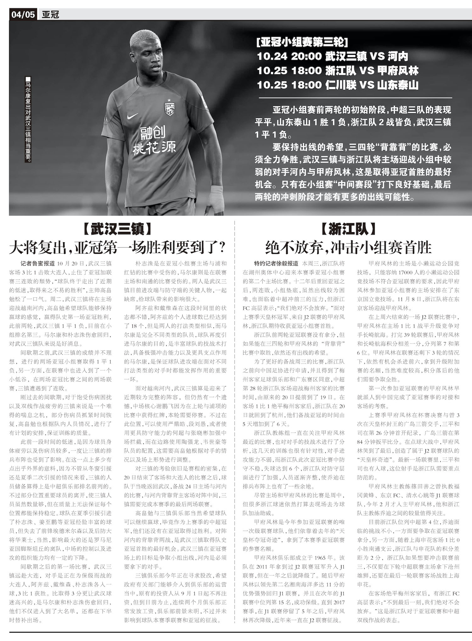 对于中超三支亚冠参赛队而言,接下来的两轮比赛是抢分的关键时间,特别是在本轮,武汉三镇与浙江队均是主场...