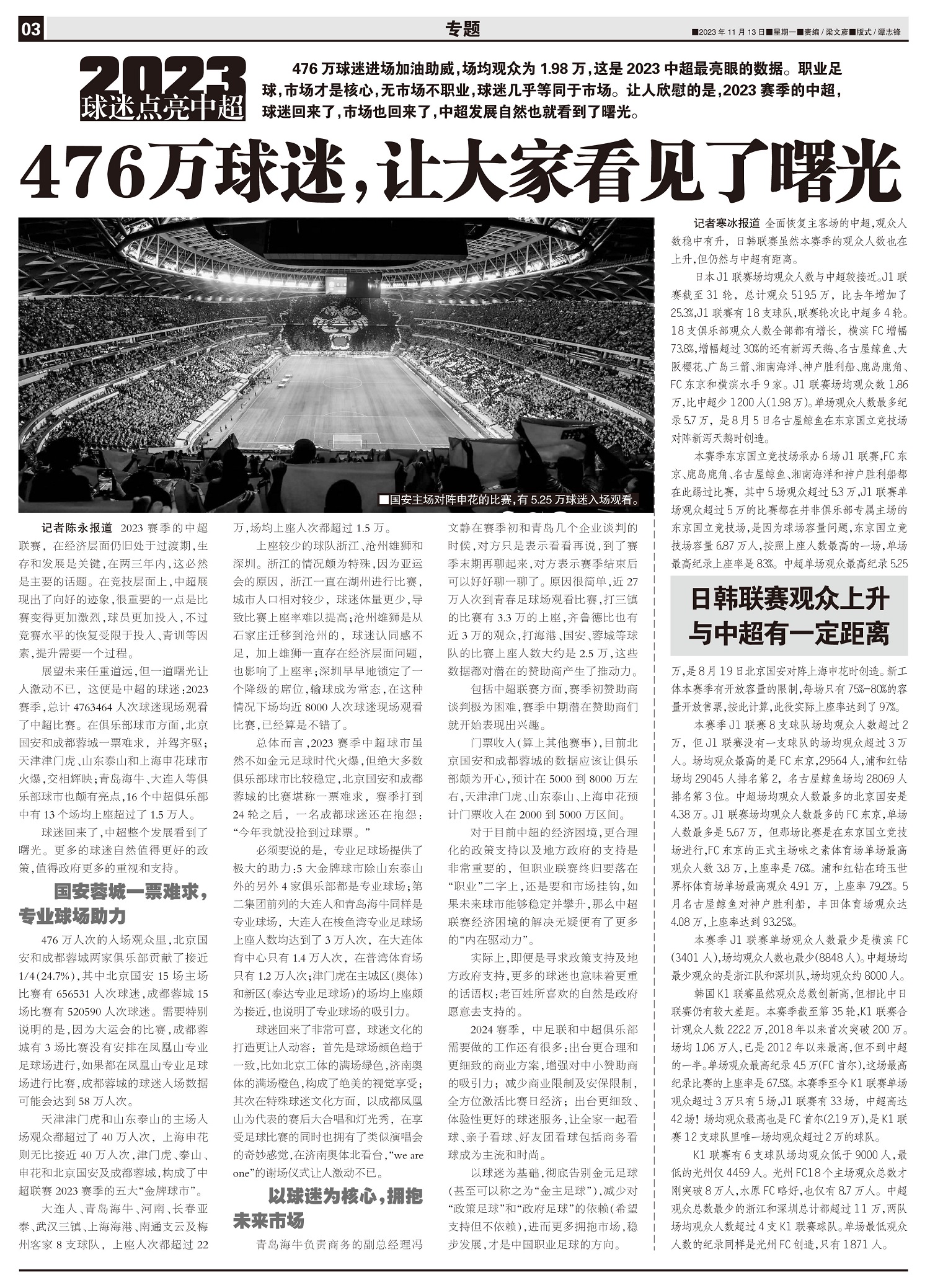 2023球迷点亮中超476万球迷进场加油助威,场均观众为1.98万,这是2023中超最亮眼的数据。职...