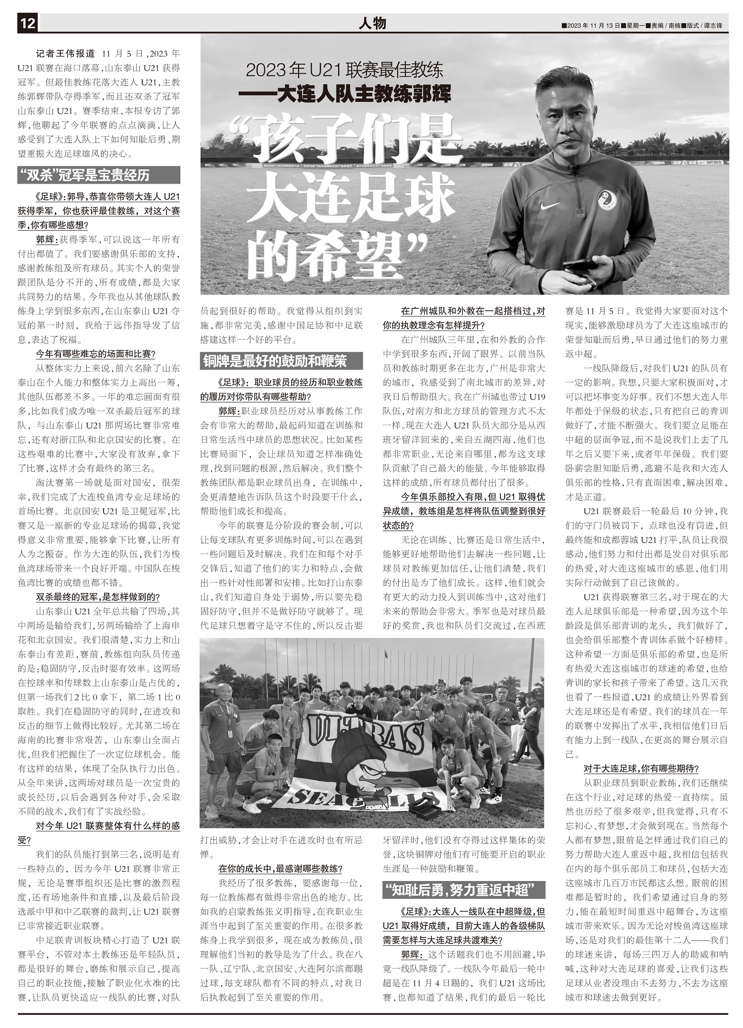 2023年U21联赛最佳教练——大连人队主教练郭辉 “孩子们是 大连足球的希望”