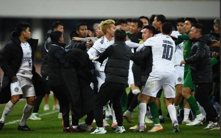 值得注意的是,武里南联11号队员库尔斯和工作人员做出了双手拇指下压的挑衅的动作;10号阿塞拜疆前锋谢伊达耶夫更是在裁判已经出面阻止的情况下,横跨大半个球场飞奔冲向浙江队球员,甚至对姚均晟进行了锁喉、裸绞等危险动作,进而引发了更大的冲突,场面极其混乱;球迷们也开始向场内投掷物品,大骂武里南联“loser”。