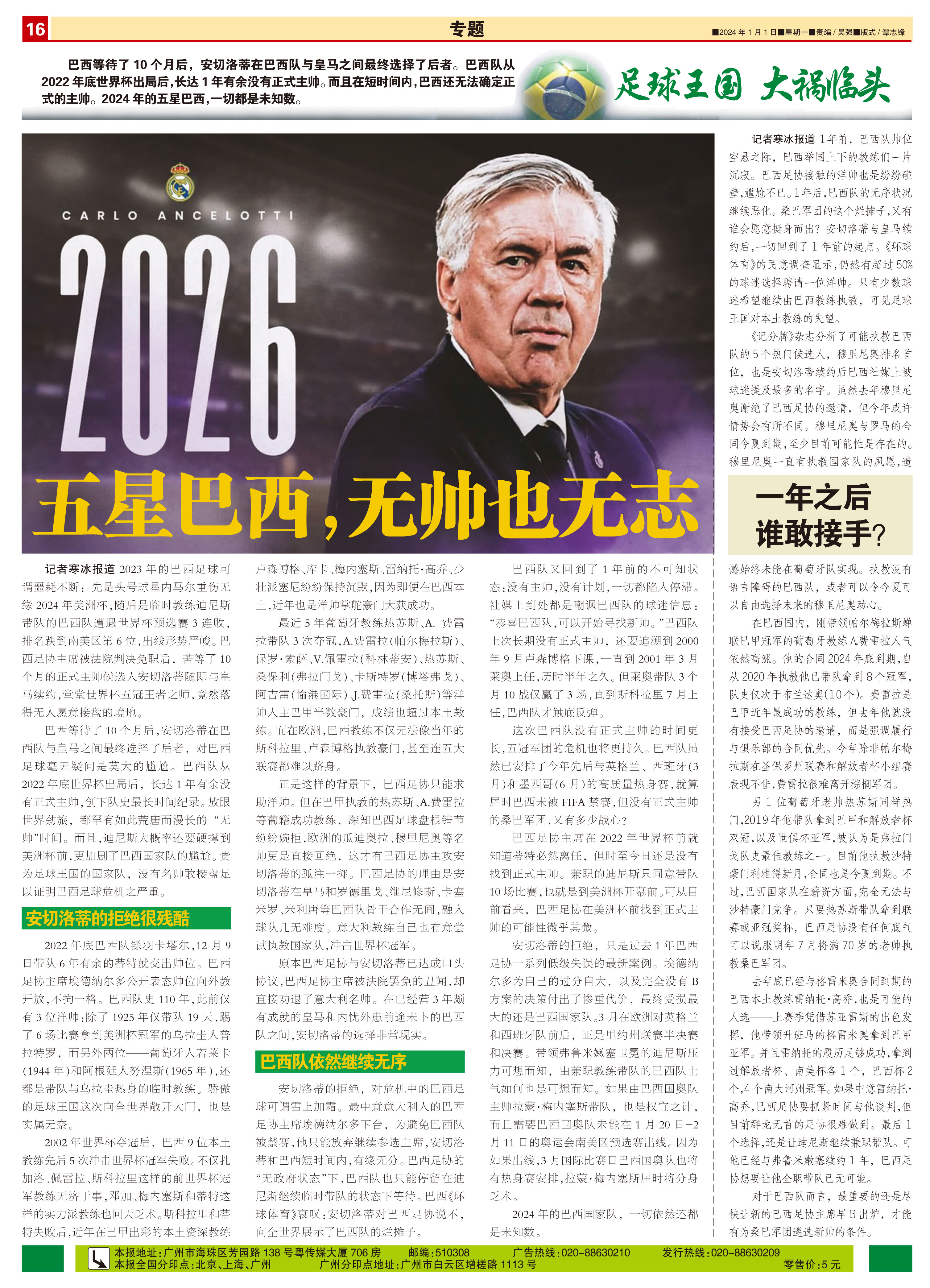 足球王国 大祸临头巴西等待了10个月后,安切洛蒂在巴西队与皇马之间最终选择了后者。巴西队从2022...