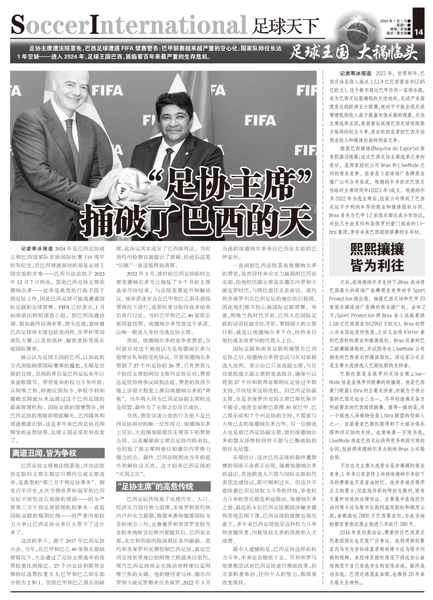 足球王国 大祸临头足协主席遭法院罢免,巴西足球遭遇FIFA禁赛警告;巴甲联赛越来越严重的空心化;国...