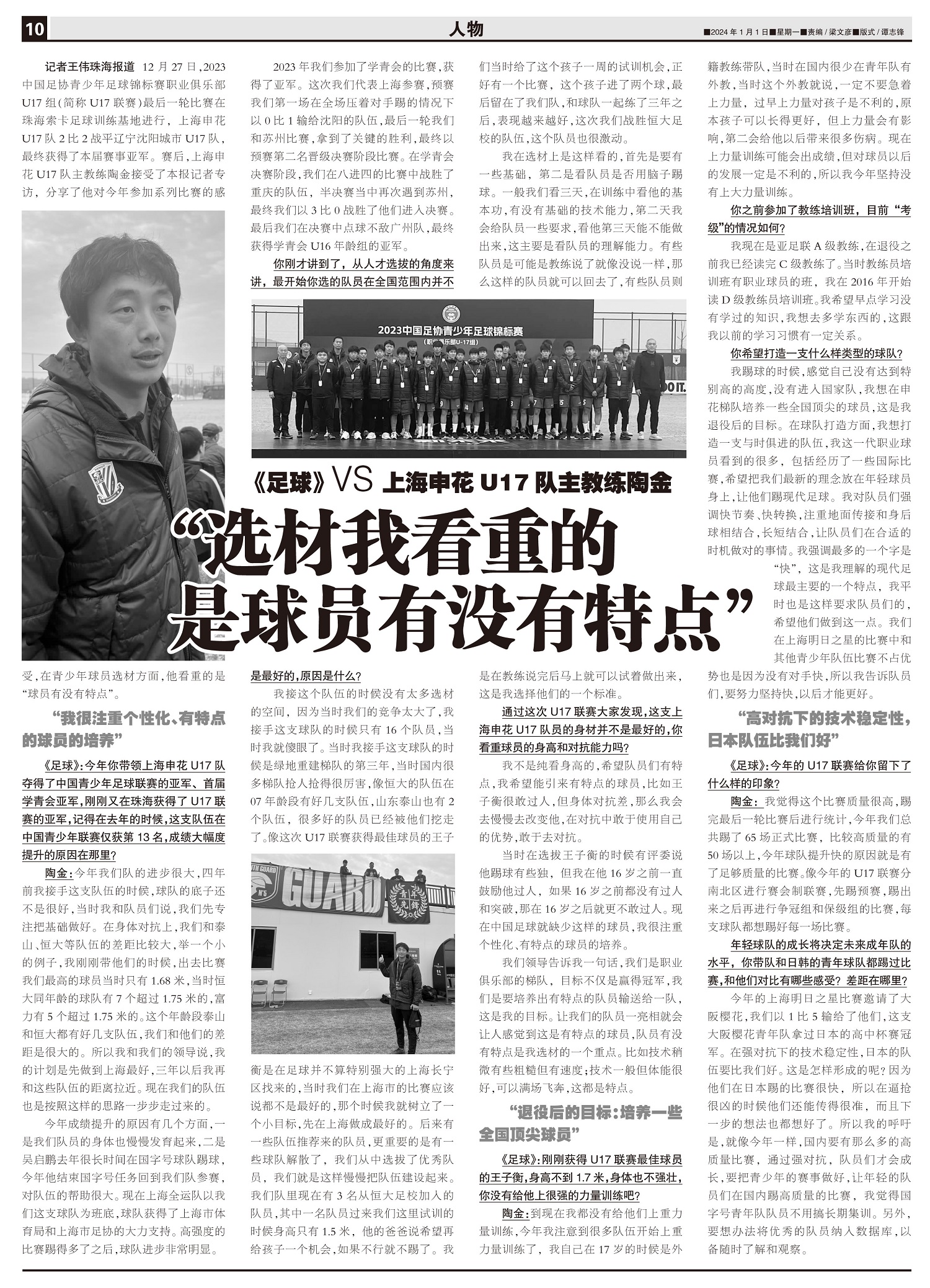 《足球》VS 上海申花U17队主教练陶金 “选材我看重的是球员有没有特点”