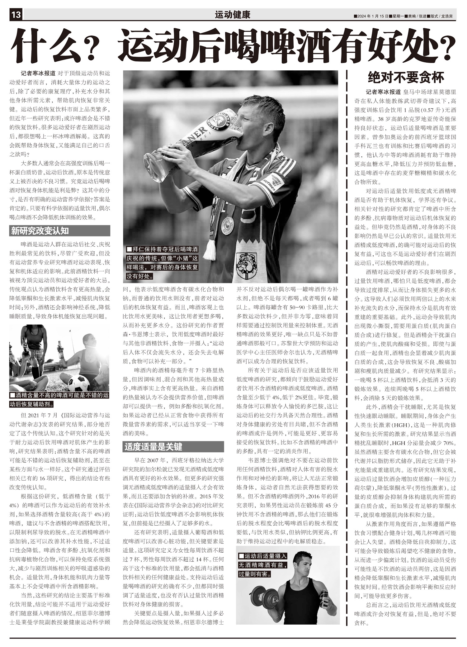 皇马中场球星莫德里奇在私人体能教练武切蒂奇建议下,高强度训练后会饮用1品脱(0.57升)无酒精啤酒。...