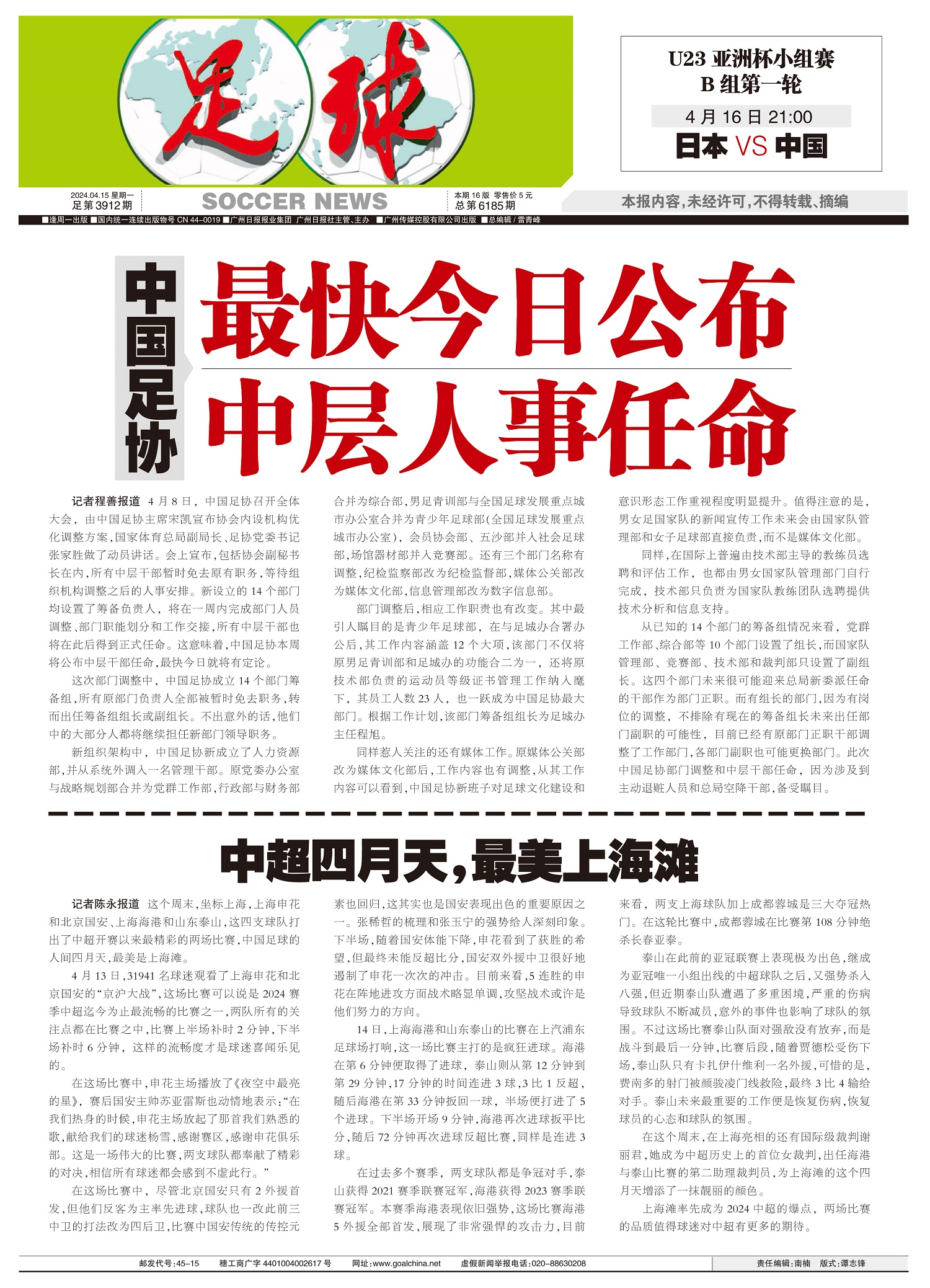 4月8日,中国足协召开全体大会,由中国足协主席宋凯宣布协会内设机构优化调整方案,国家体育总局副局长、...