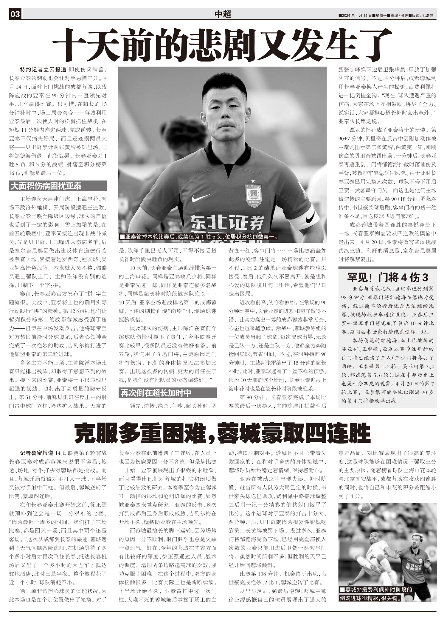 即使伤兵满营,长春亚泰的韧劲也会让对手忌惮三分。4月14日,面对上门挑战的成都蓉城,以残阵应战的亚泰...