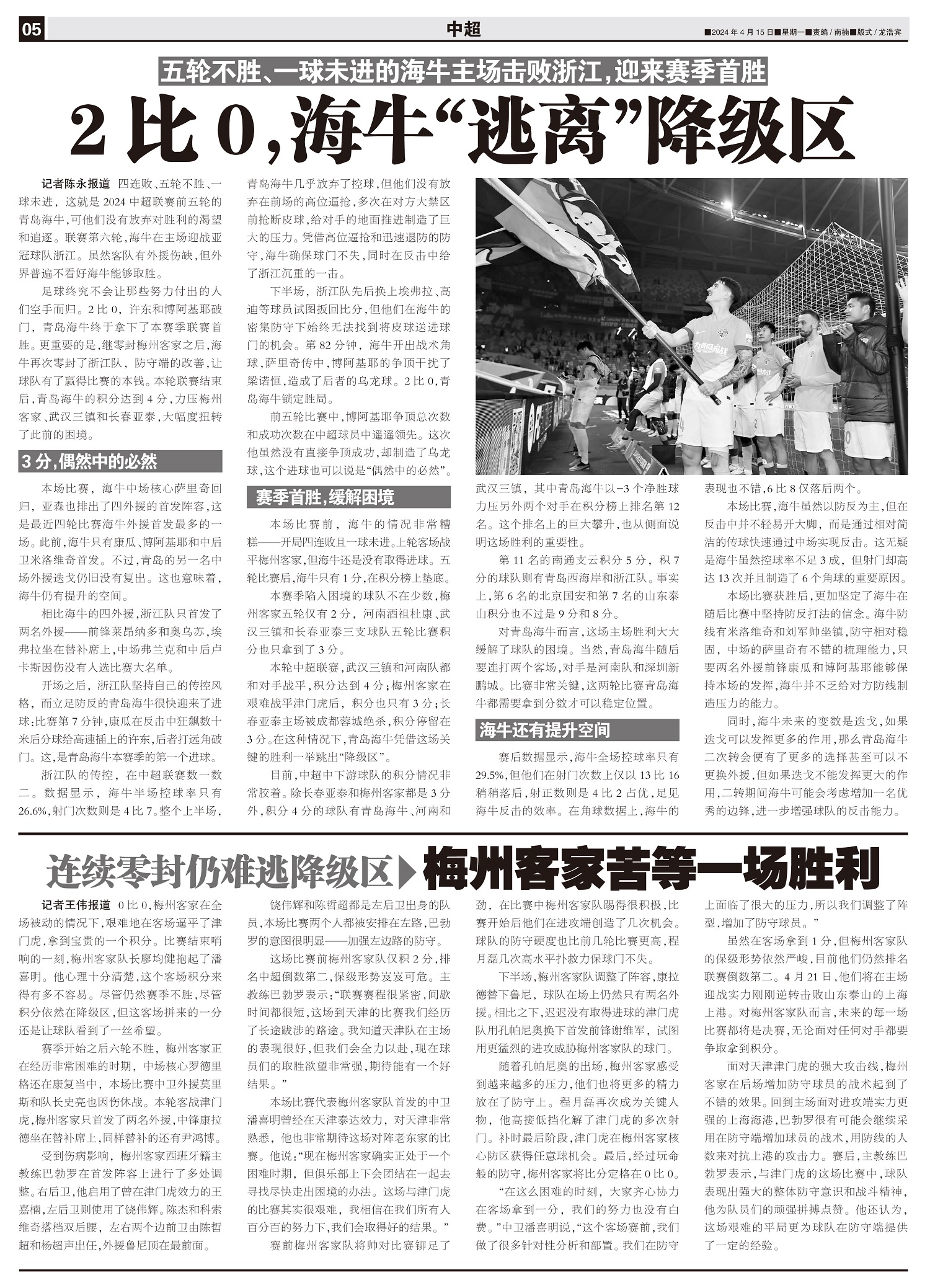 五轮不胜、一球未进的海牛主场击败浙江,迎来赛季首胜 2比0,海牛“逃离”降级区