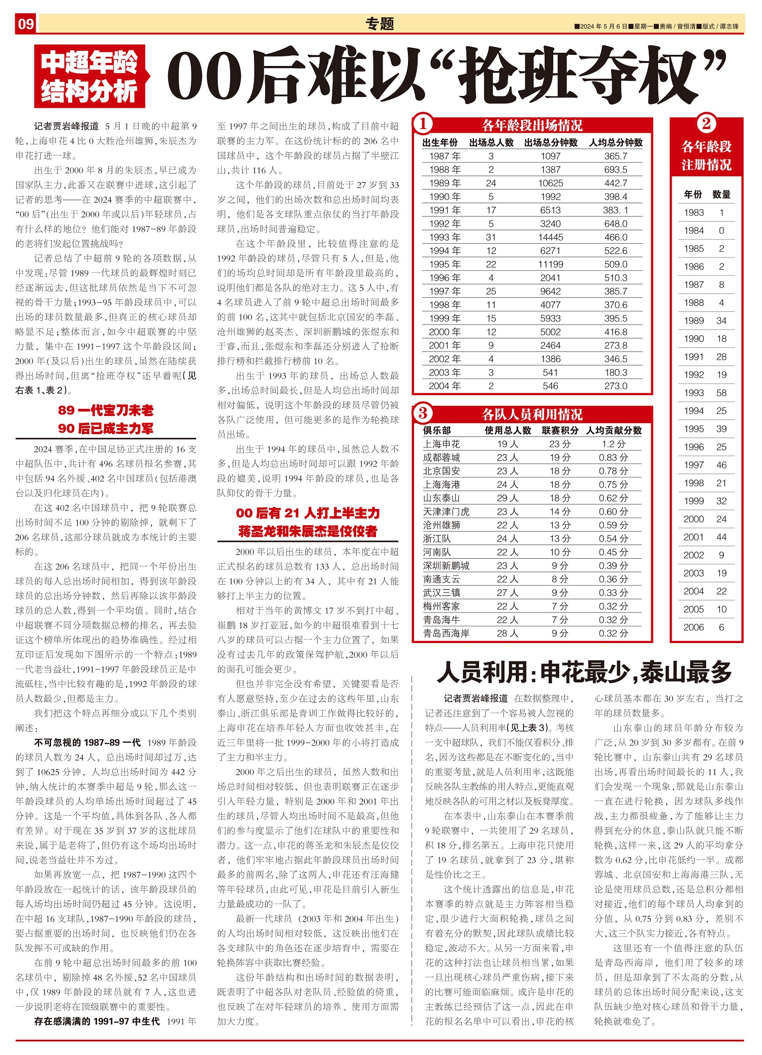 在数据整理中,记者还注意到了一个容易被人忽视的特点——人员利用率(见上表3)。考核一支中超球队,我们...