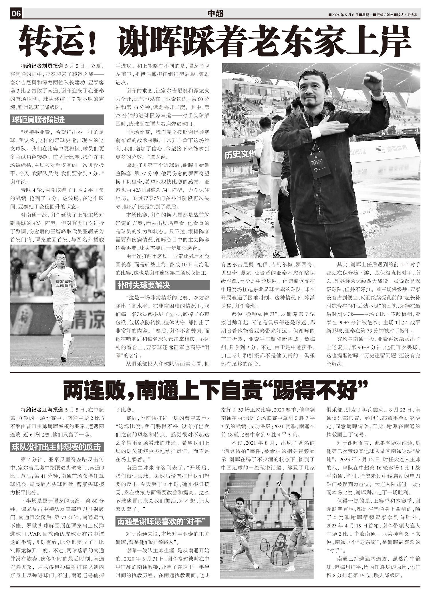 5月5日,在中超第10轮的一场比赛中,南通主场2比3不敌由昔日主帅谢晖率领的亚泰,遭遇两连败,近6场...