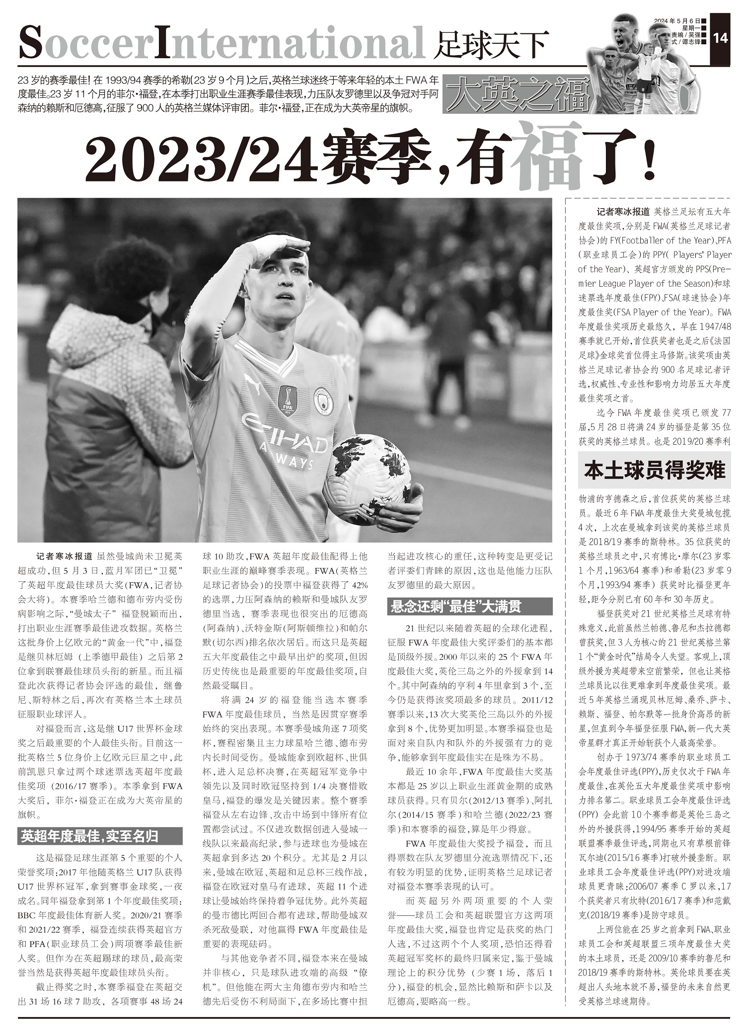 大英之福23岁的赛季最佳!在1993/94赛季的希勒(23岁9个月)之后,英格兰球迷终于等来年轻的本...