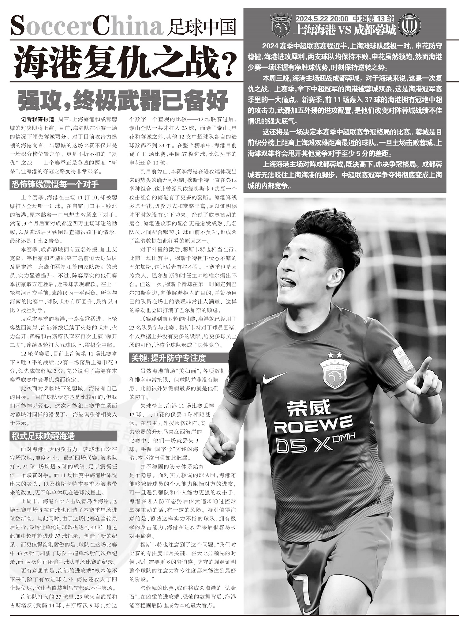 2024.5.22 20:00 中超第13轮上海海港VS成都蓉城2024赛季中超联赛赛程近半,上海...