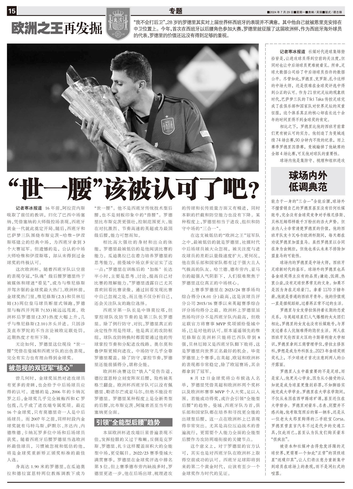 欧洲之王再发掘“我不会打后卫”,28岁的罗德里其实对上届世界杯西班牙的表现并不满意,其中他自己就被恩...