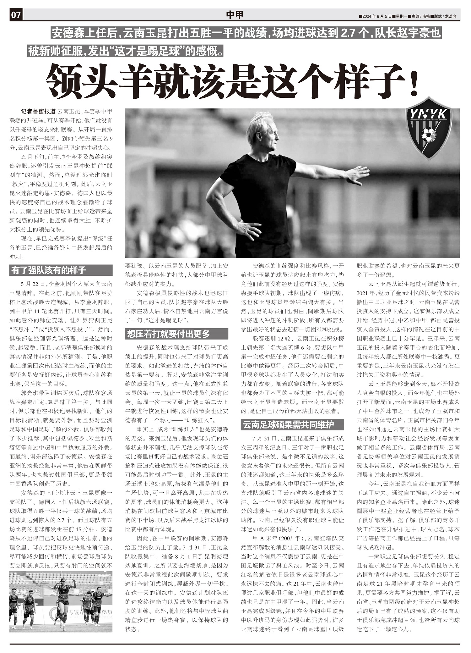 安德森上任后,云南玉昆打出五胜一平的战绩,场均进球达到2.7个,队长赵宇豪也被新帅征服,发出“这才是...