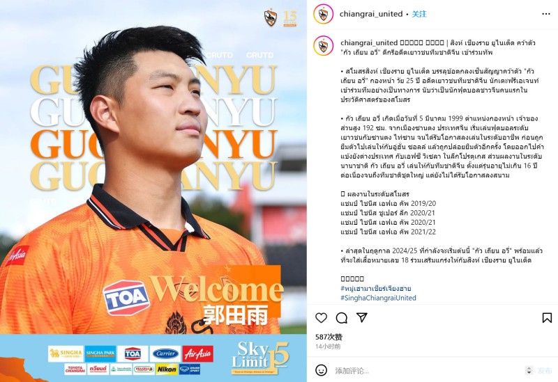 清莱联在官方公告中表示:“清莱联俱乐部与球员达成协议,签下25岁的前锋郭田雨,球员自由身加入球队。”随后,清莱联介绍了郭田雨的基本情况,包括他曾留洋葡萄牙。