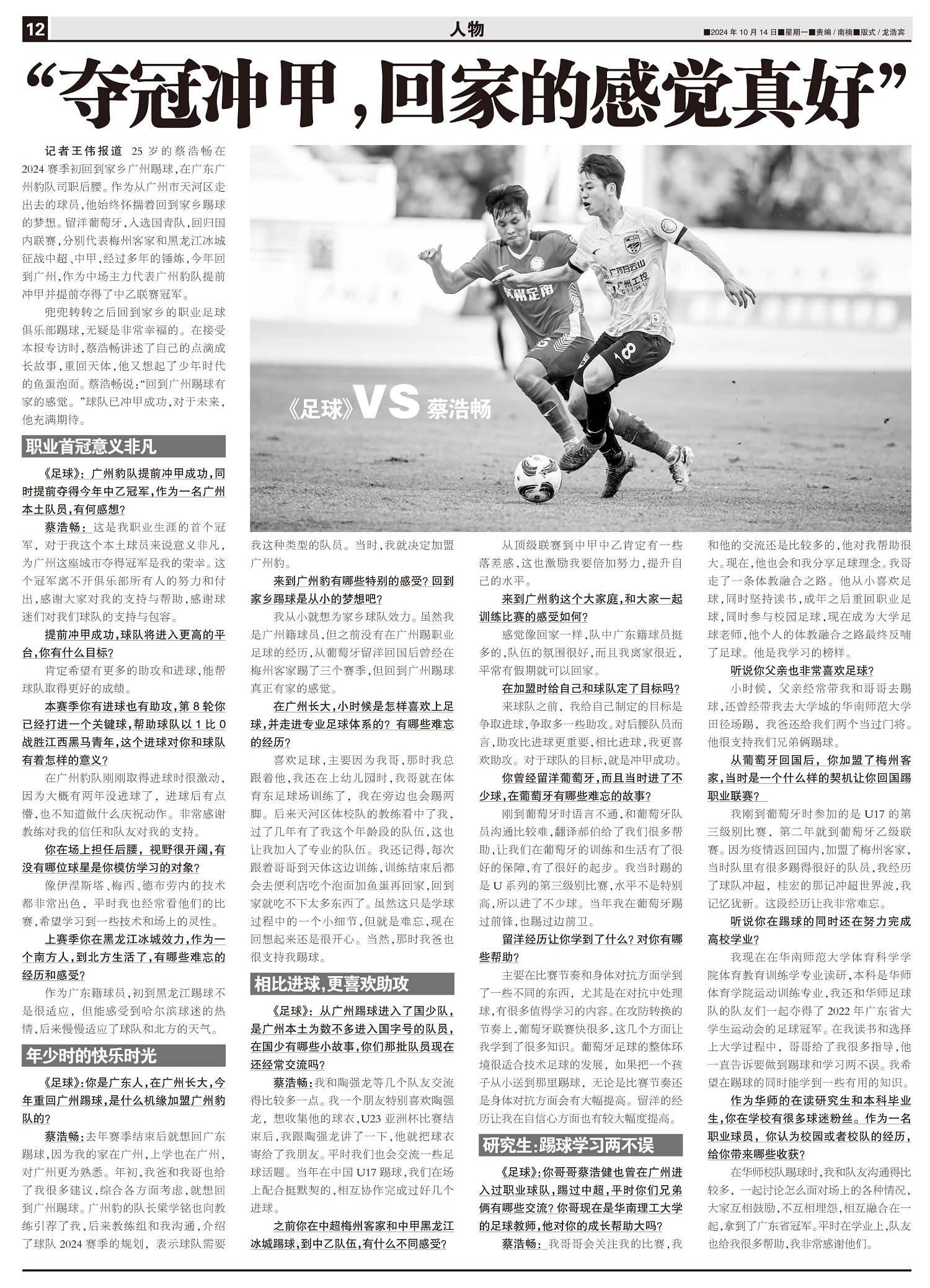 25岁的蔡浩畅在2024赛季初回到家乡广州踢球,在广东广州豹队司职后腰。作为从广州市天河区走出去的球...