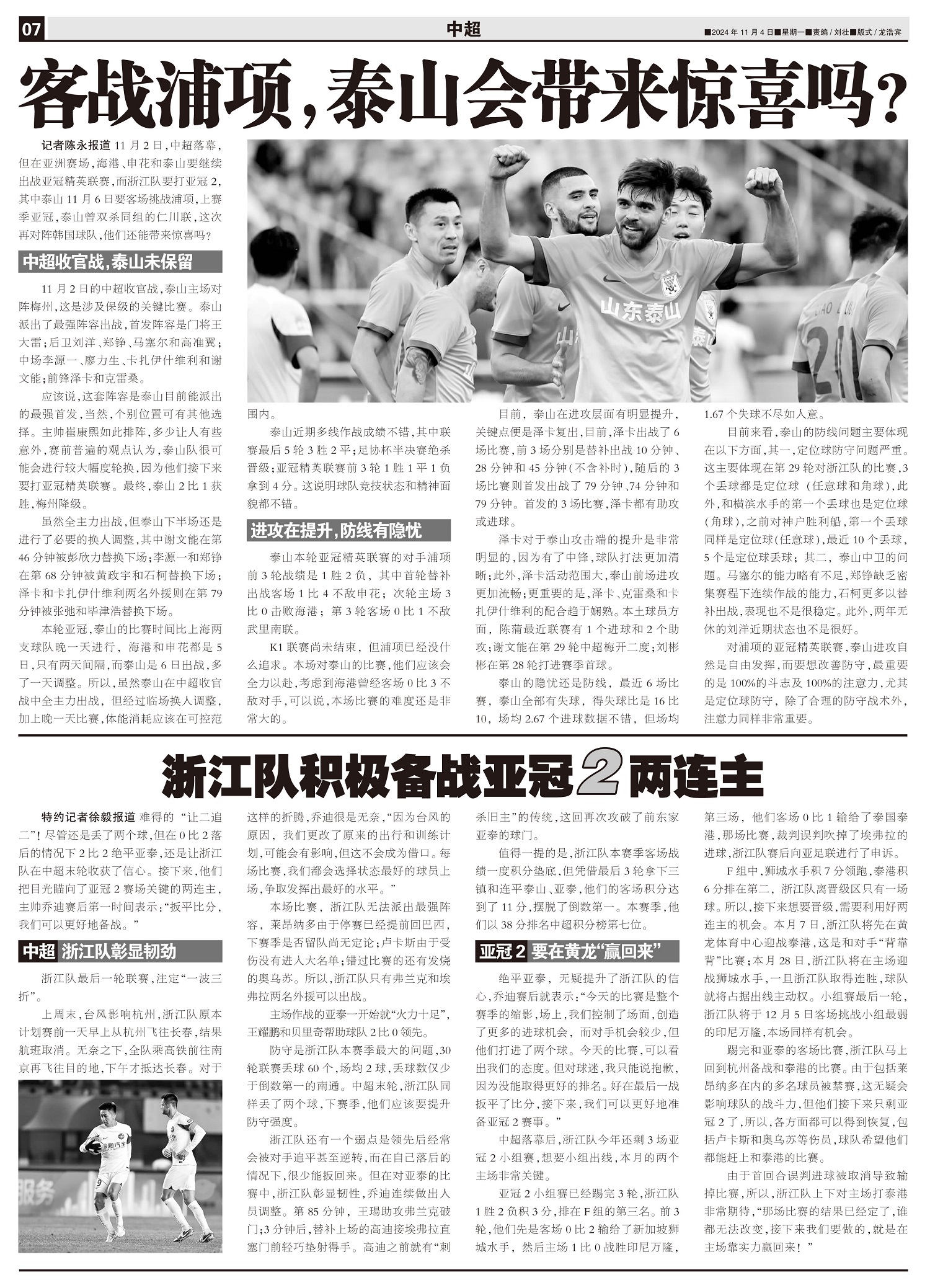 11月2日,中超落幕,但在亚洲赛场,海港、申花和泰山要继续出战亚冠精英联赛,而浙江队要打亚冠2,其中...