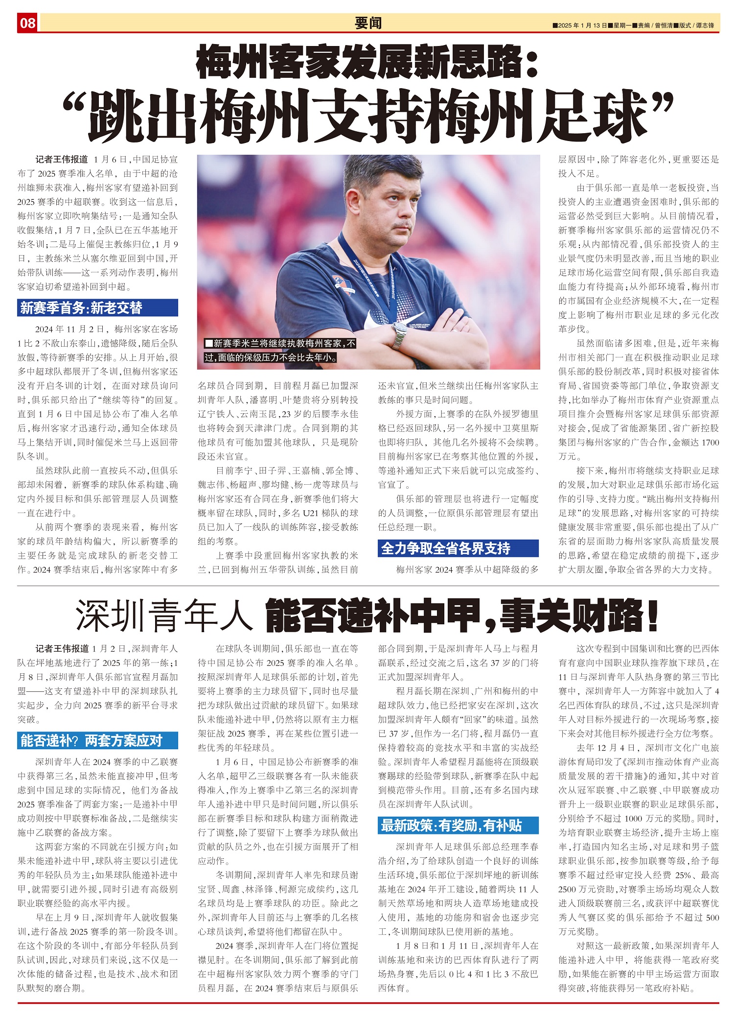 去年11月2日,梅州客家队在中超联赛最后一轮比赛中客场不敌山东泰山遗憾降级。今年1月6日,在中国足协...