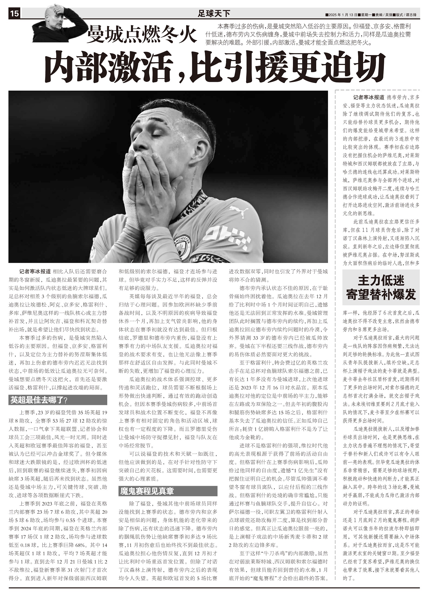本赛季曼城在大面积伤病背景下,出现空前的成绩危机,很大程度上与瓜帅在球市操作上的失误有直接关系。瓜迪...