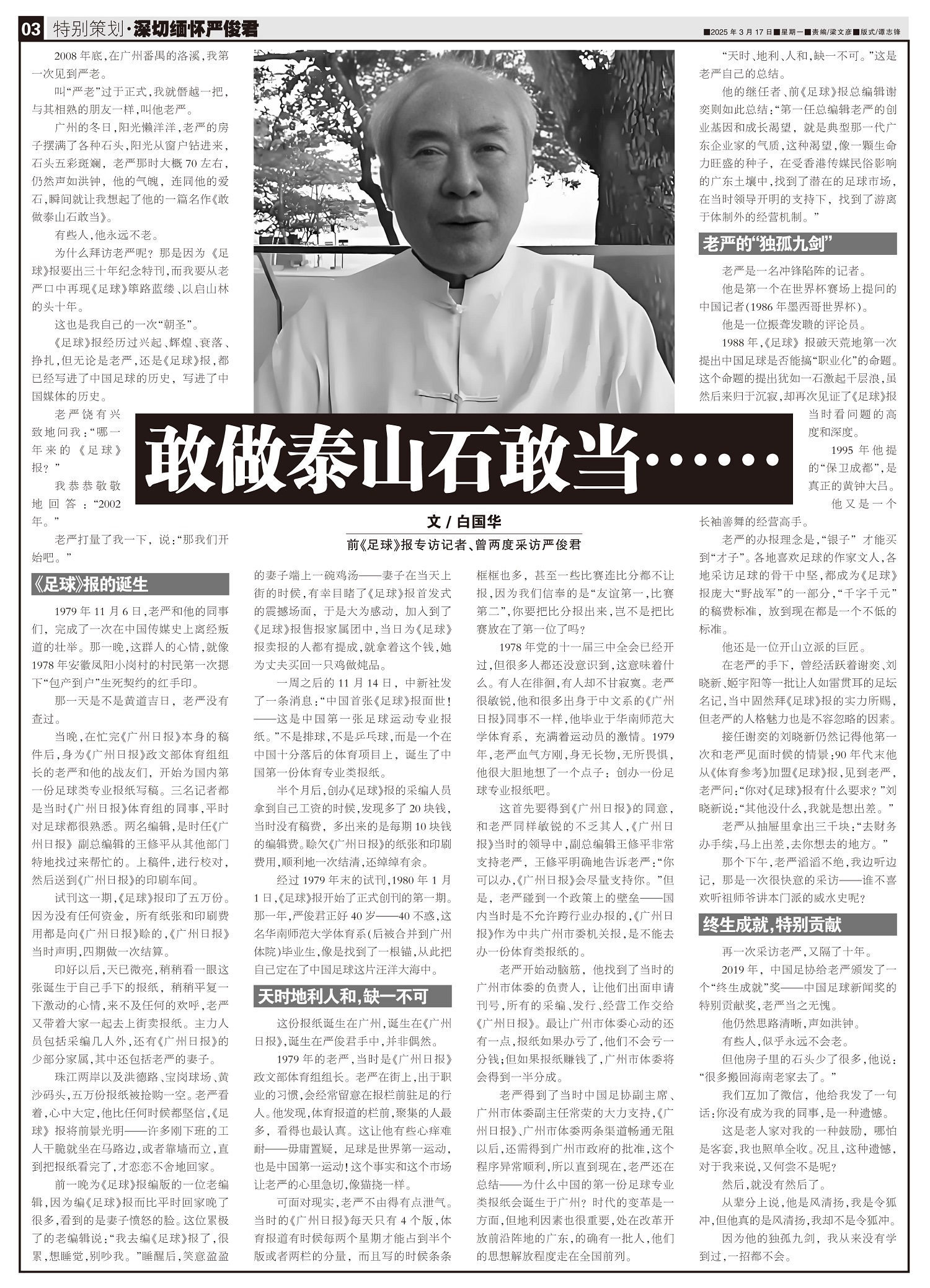 《足球》报创刊人严俊君同志因病于2025年3月14日离世,享年86岁。