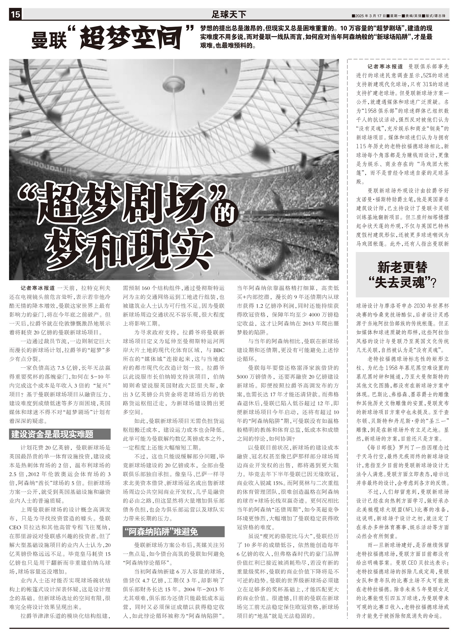 曼联“超梦空间”梦想的提出总是激昂的,但现实又总是困难重重的。10万容量的“超梦剧场”,建造的现实难...