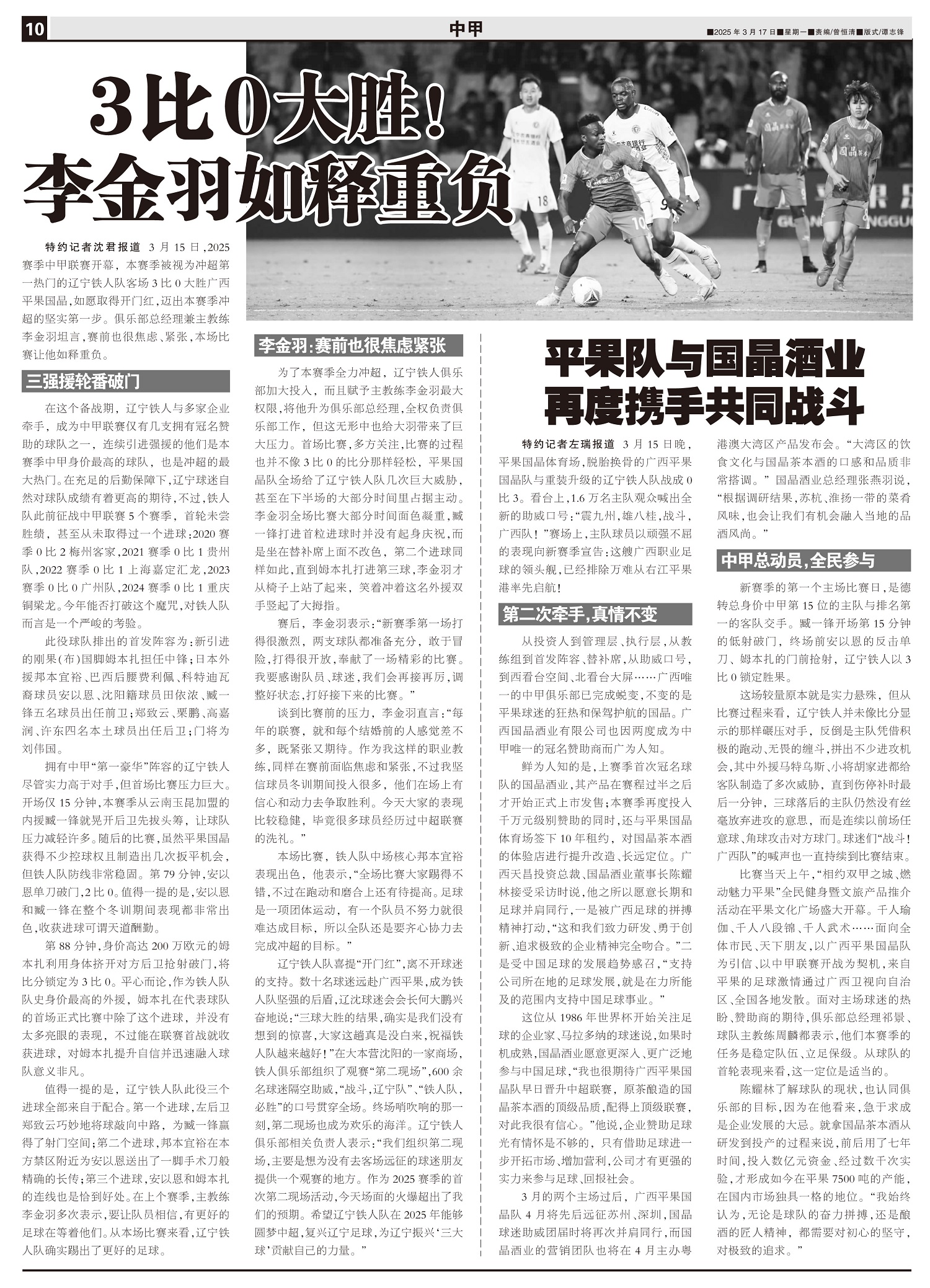 3月15日,2025赛季中甲联赛开幕,本赛季被视为冲超第一热门的辽宁铁人队客场3比0大胜广西平果国晶...