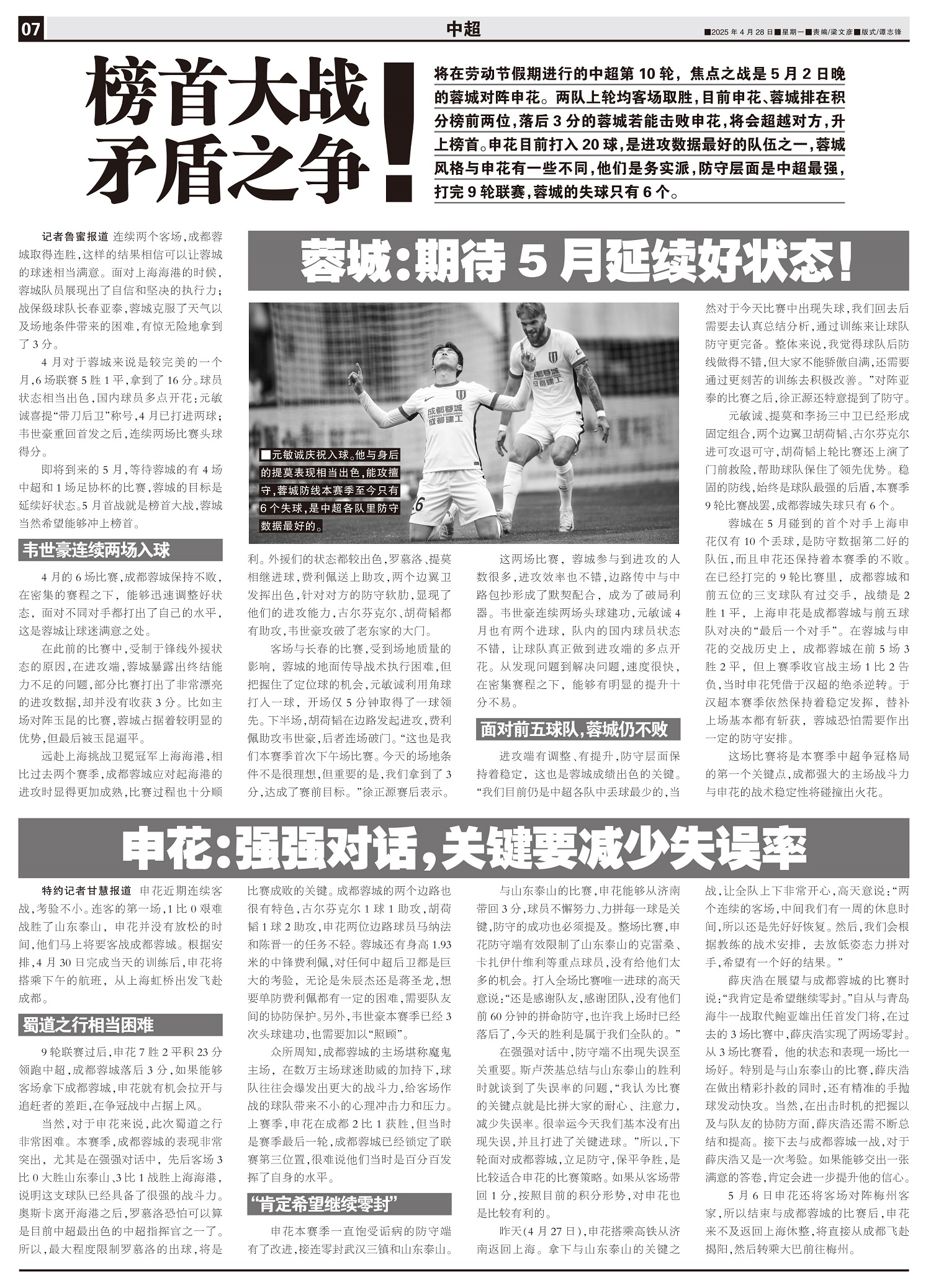 将在劳动节假期进行的中超第10轮,焦点之战是5月2日晚的蓉城对阵申花。两队上轮均客场取胜,目前申花、...