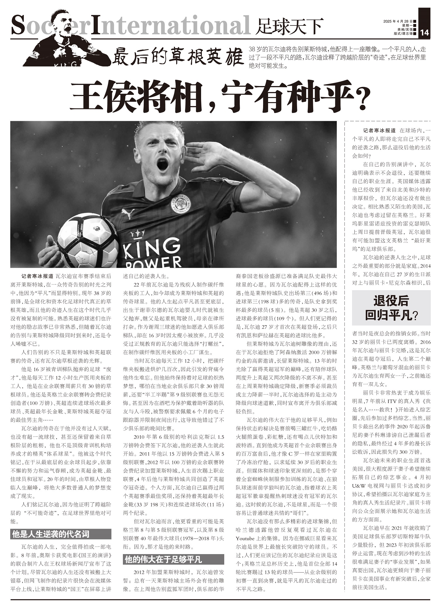 最后的草根英雄38岁的瓦尔迪将告别莱斯特城,他配得上一座雕像。一个平凡的人,走过了一段不平凡的路,瓦...