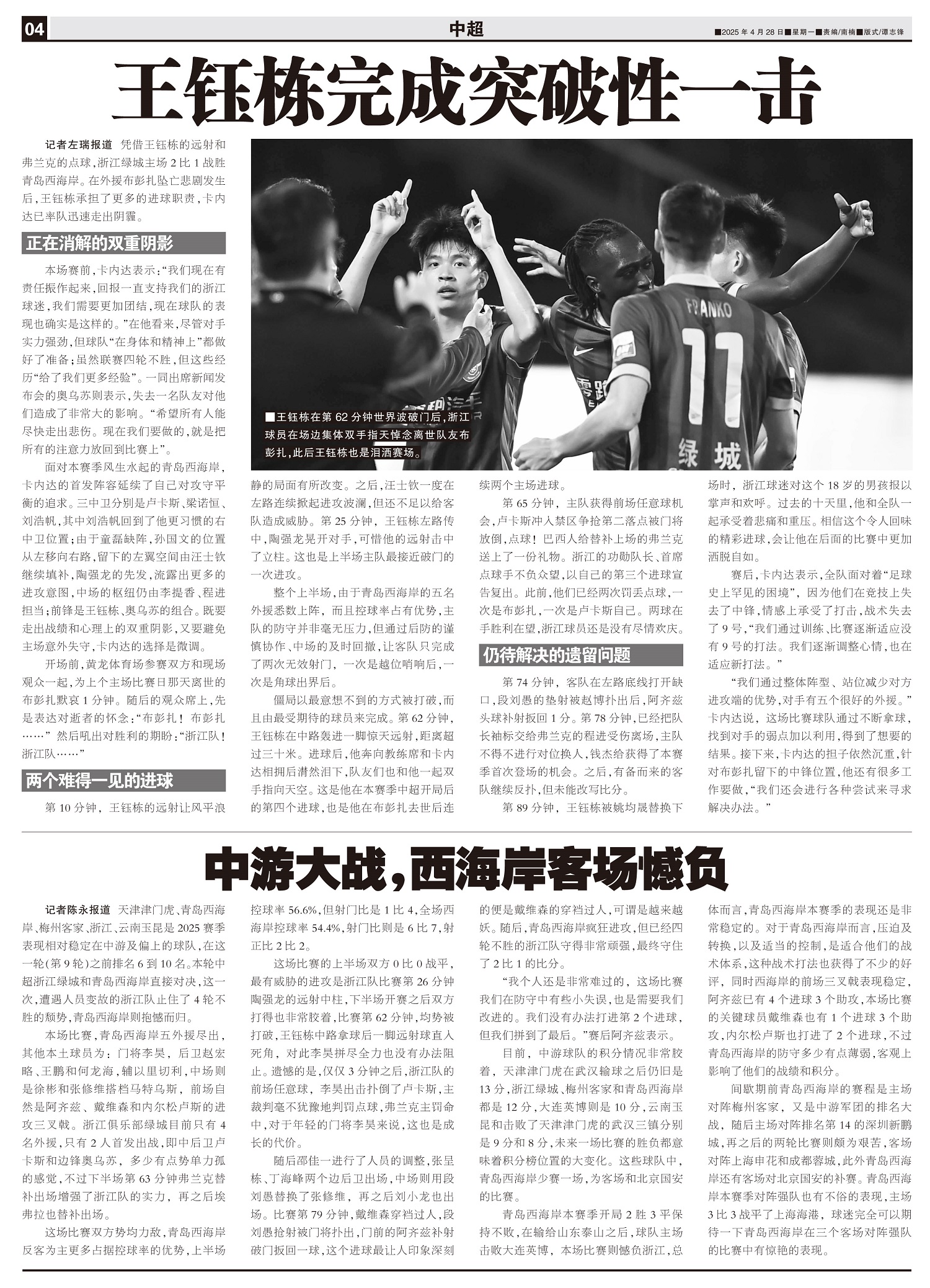 凭借王钰栋的远射和弗兰克的点球,浙江绿城主场2比1战胜青岛西海岸。在外援布彭扎坠亡悲剧发生后,王钰栋...