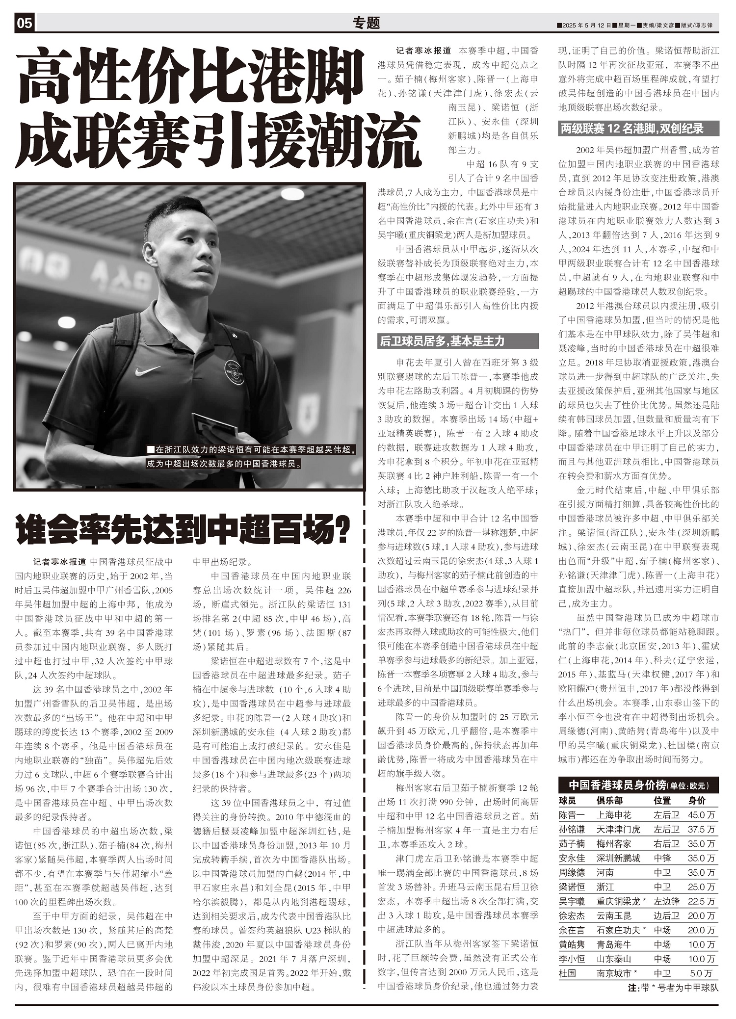 本赛季中超,中国香港球员凭借稳定表现,成为中超亮点之一。茹子楠(梅州客家)、陈晋一(上海申花)、孙铭...