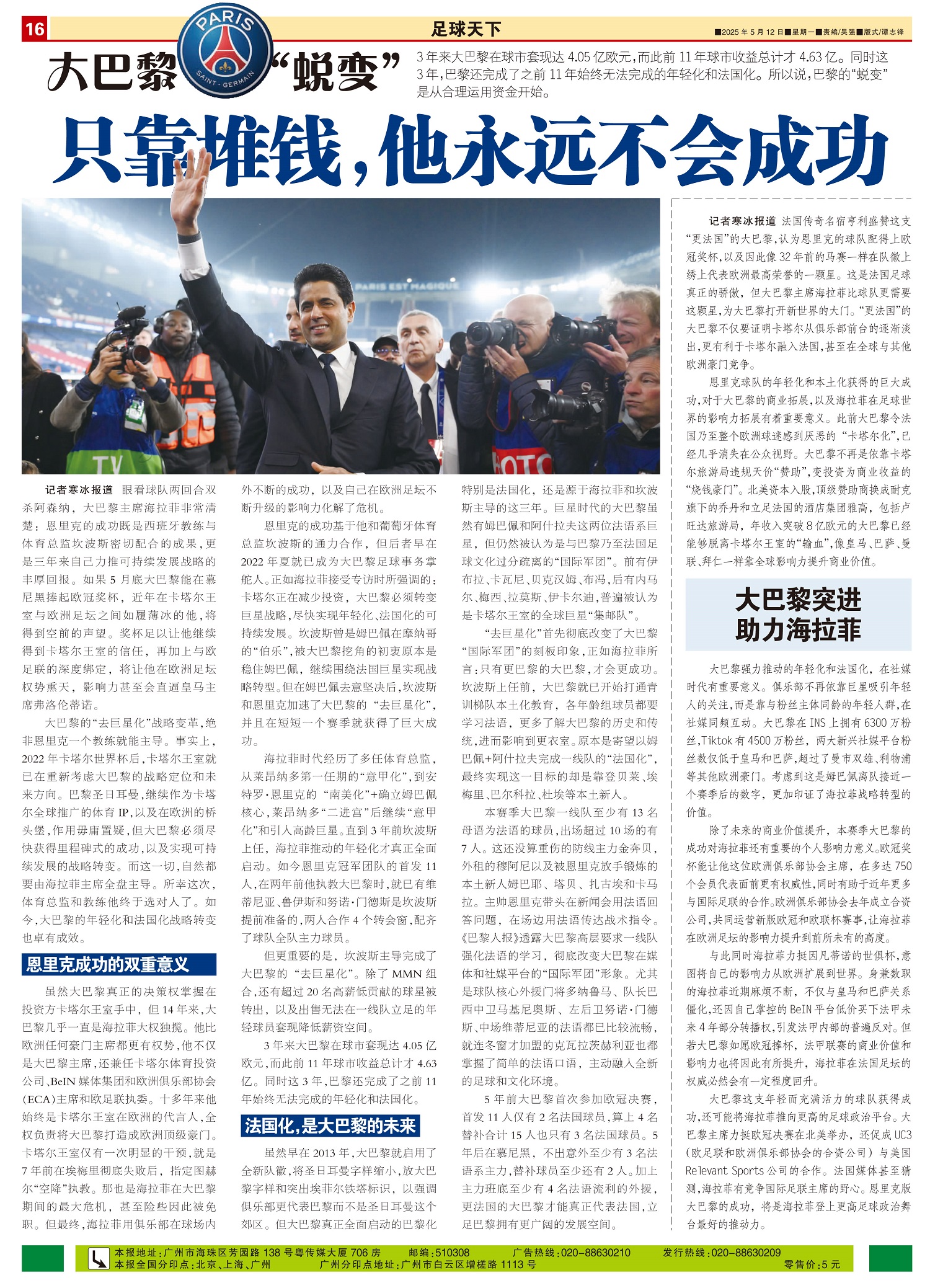 大巴黎“蜕变”大巴黎不再是全靠“烧钱”,寄望于吸引巨星加盟征服欧洲的“拜金”豪门。在恩里克的带领下,...