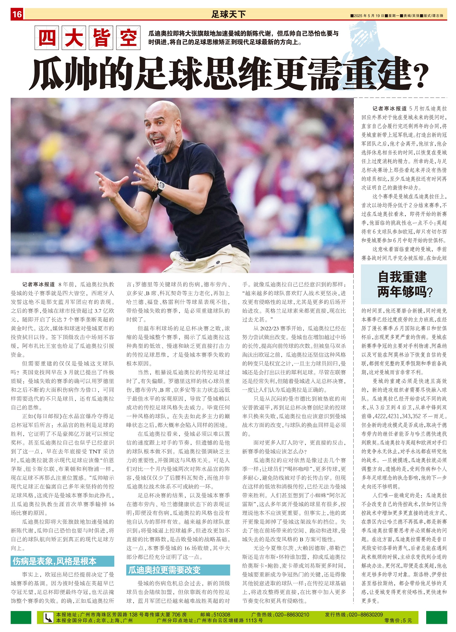 四大皆空瓜迪奥拉即将大张旗鼓地加速曼城的新陈代谢,但瓜帅自己恐怕也要与时俱进,将自己的足球思维矫正到...
