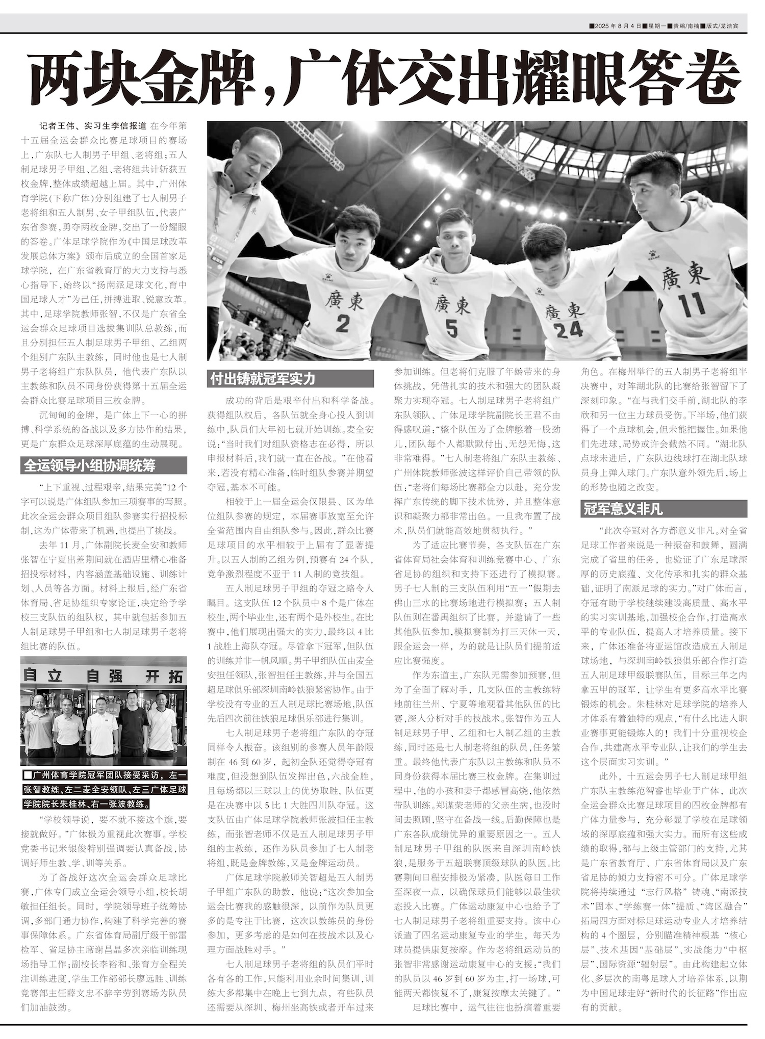 十五运会群众比赛足球项目除了广州体育学院代表广东夺得两枚金牌之外,其他项目的广东队同样为广东省顽强拼...