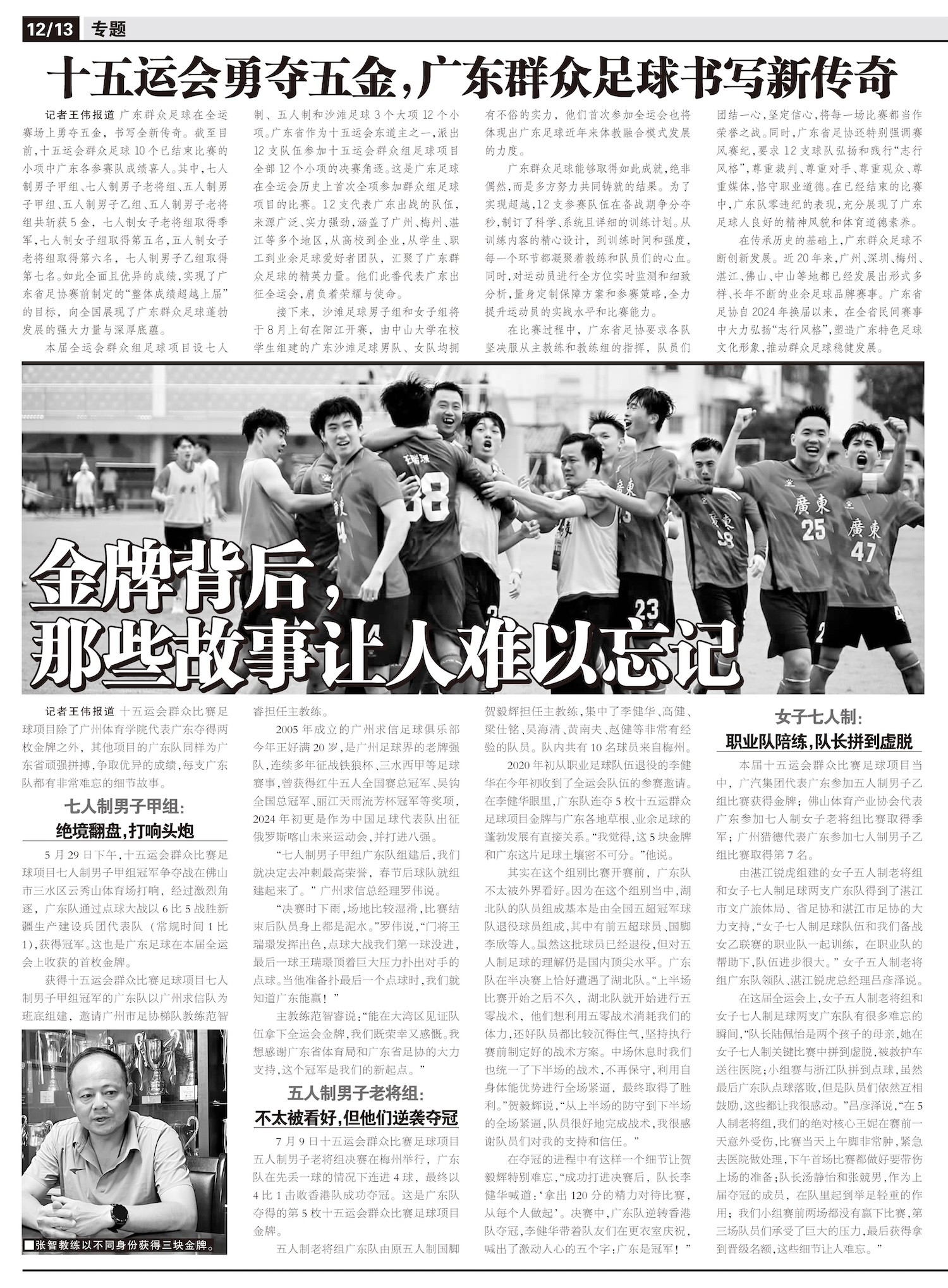 在今年第十五届全运会群众比赛足球项目的赛场上,广东队七人制男子甲组、老将组;五人制足球男子甲组、乙组...