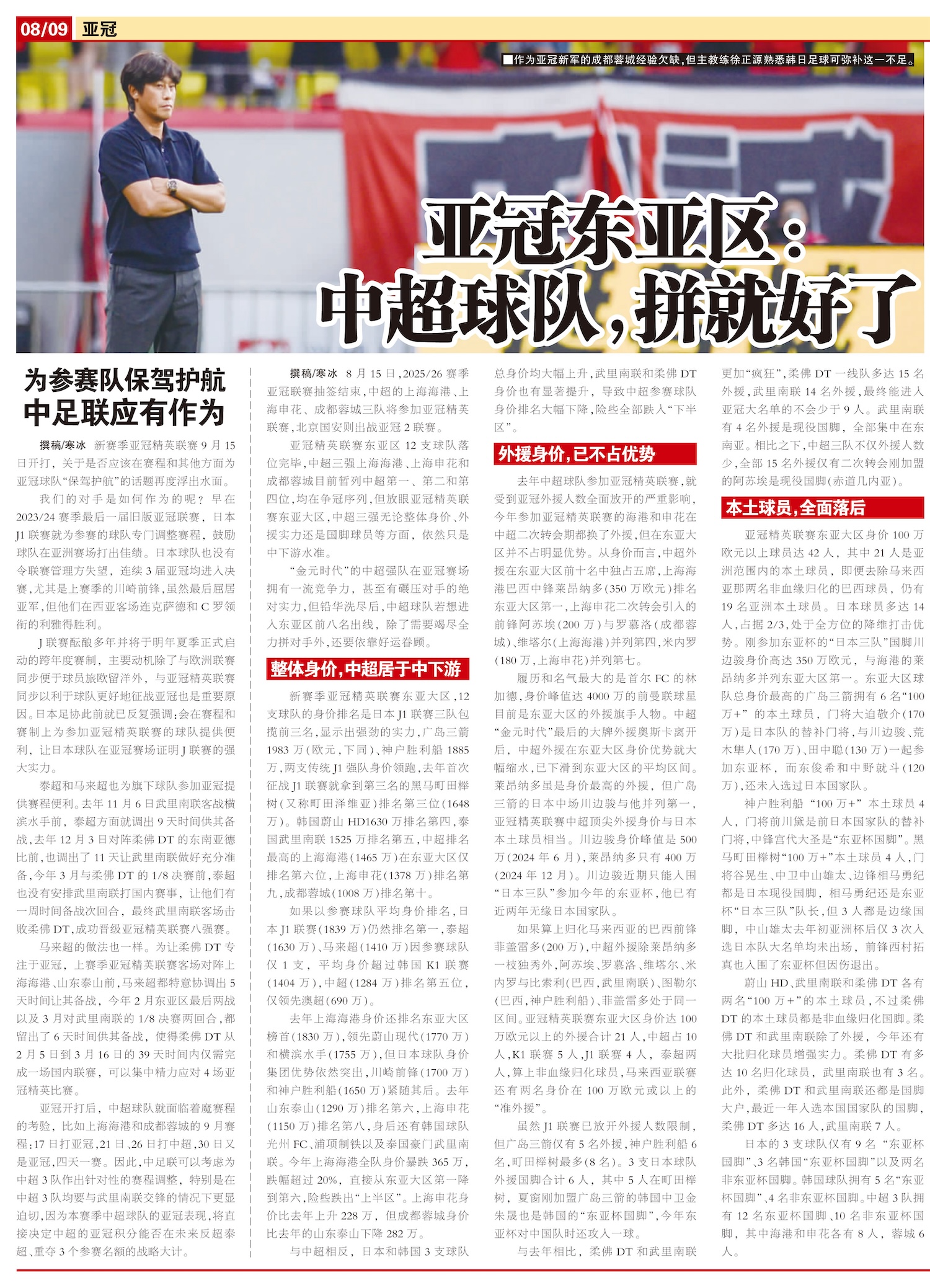 8月15日,2025/26赛季亚冠联赛抽签结束,中超的上海海港、上海申花、成都蓉城三队将参加亚冠精英...