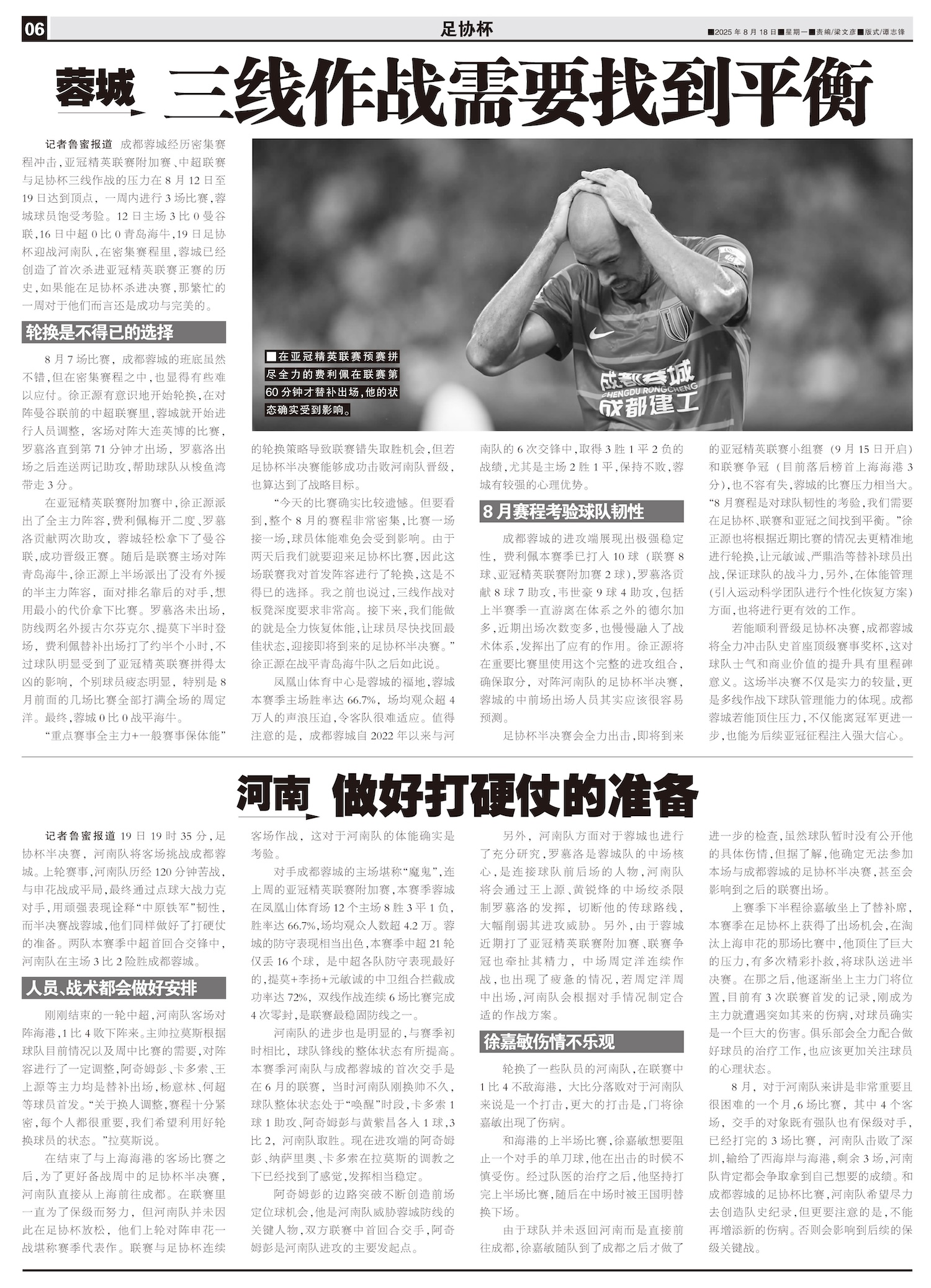 成都蓉城经历密集赛程冲击,亚冠精英联赛附加赛、中超联赛与足协杯三线作战的压力在8月12日至19日达到...